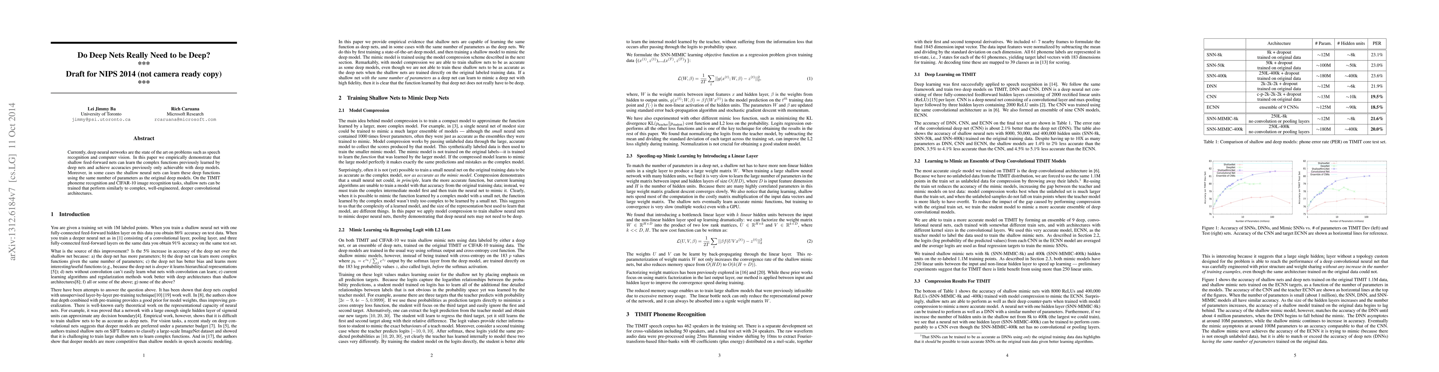 This paper demonstrates that shallow feed-forward neural networks can achieve the same performance as deep networks on tasks like speech recognition, using fewer parameters in some cases. The study suggests that better training algorithms for shallow networks might exist.