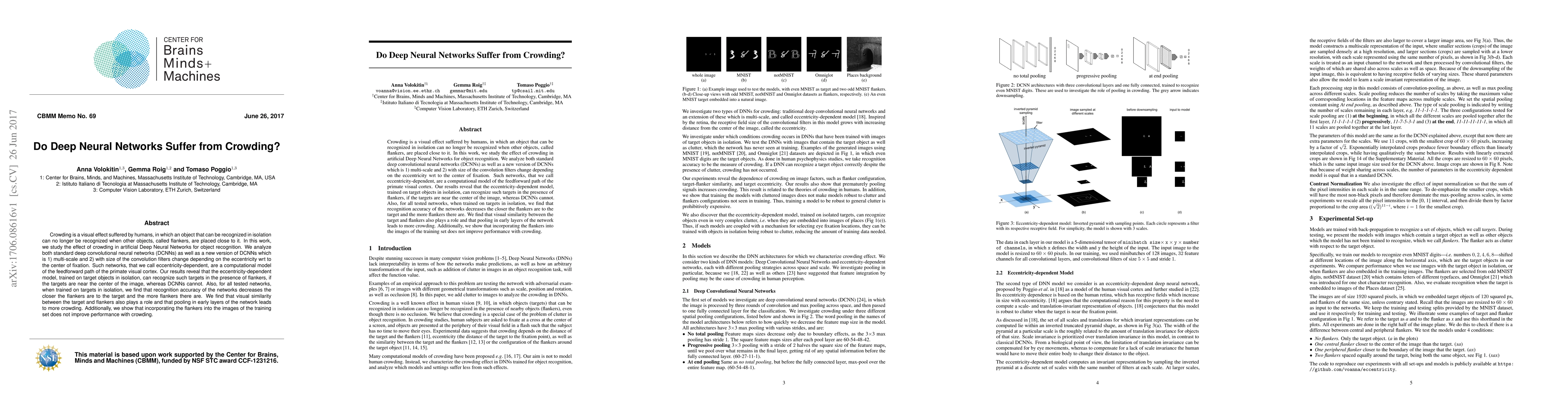 Crowding is a visual effect suffered by humans, in which an object that can be recognized in isolation can no longer be recognized when other objects, called flankers, are placed close to it. In this work, we study the effect of crowding in artificial Deep Neural Networks for object recognition. We analyze both standard deep convolutional neural networks (DCNNs) as well as a new version of DCNNs which is 1) multi-scale and 2) with size of the convolution filters change depending on the eccentricity wrt to the center of fixation. Such networks, that we call eccentricity-dependent, are a computational model of the feedforward path of the primate visual cortex. Our results reveal that the eccentricity-dependent model, trained on target objects in isolation, can recognize such targets in the presence of flankers, if the targets are near the center of the image, whereas DCNNs cannot. Also, for all tested networks, when trained on targets in isolation, we find that recognition accuracy of the networks decreases the closer the flankers are to the target and the more flankers there are. We find that visual similarity between the target and flankers also plays a role and that pooling in early layers of the network leads to more crowding. Additionally, we show that incorporating the flankers into the images of the training set does not improve performance with crowding.