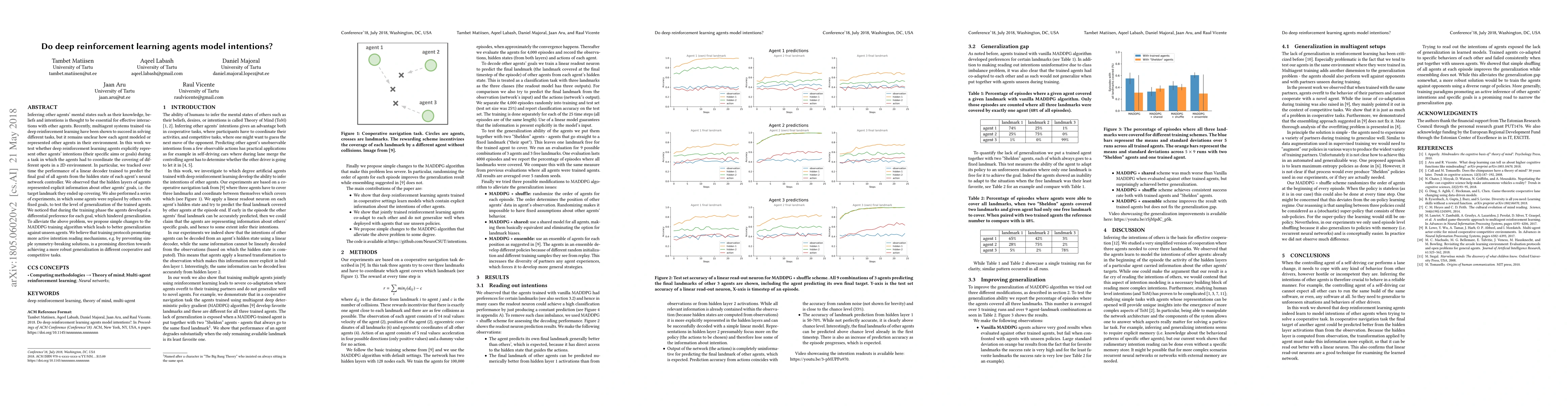 This paper investigates whether deep reinforcement learning agents model intentions by examining their ability to coordinate in a 2D environment. It finds that agents' hidden states contain explicit information about other agents' goals, but they struggle with generalization due to developing preferences for specific goals. The authors propose modifications to the MADDPG algorithm to improve generalization.
