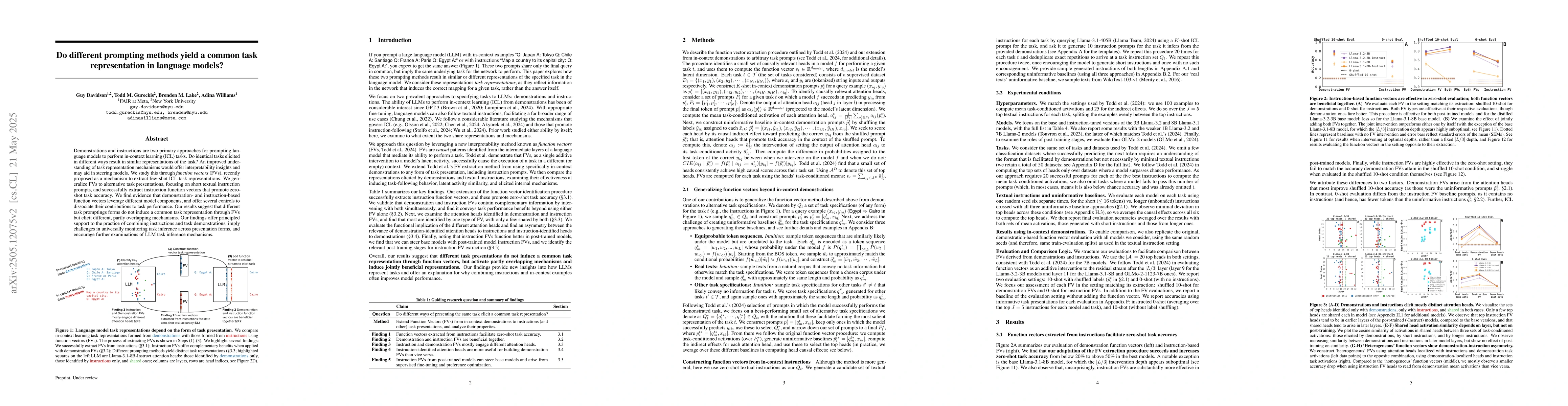 This work distinguishes itself by demonstrating that different prompting methods elicit different, partly overlapping task representation mechanisms in language models, challenging the notion of a common underlying representation.