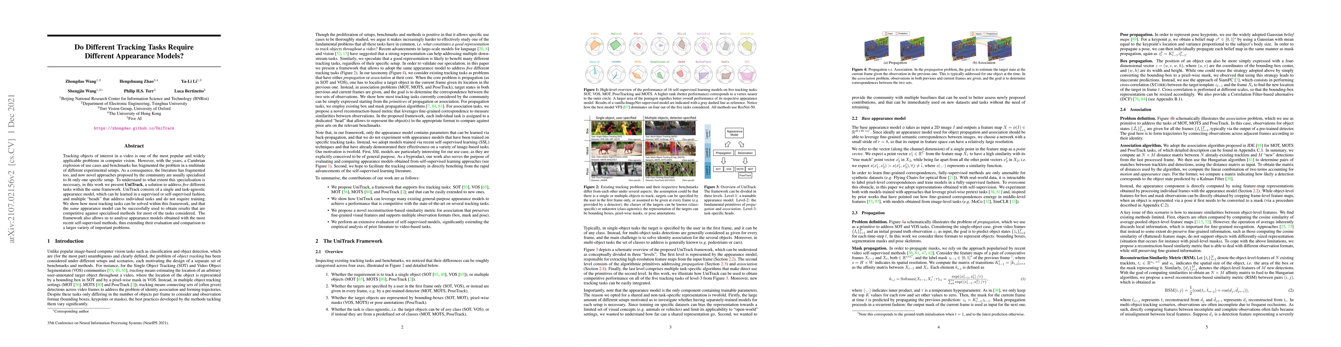 Tracking objects of interest in a video is one of the most popular and widely applicable problems in computer vision. However, with the years, a Cambrian explosion of use cases and benchmarks has fragmented the problem in a multitude of different experimental setups. As a consequence, the literature has fragmented too, and now novel approaches proposed by the community are usually specialised to fit only one specific setup. To understand to what extent this specialisation is necessary, in this work we present UniTrack, a solution to address five different tasks within the same framework. UniTrack consists of a single and task-agnostic appearance model, which can be learned in a supervised or self-supervised fashion, and multiple ``heads'' that address individual tasks and do not require training. We show how most tracking tasks can be solved within this framework, and that the same appearance model can be successfully used to obtain results that are competitive against specialised methods for most of the tasks considered. The framework also allows us to analyse appearance models obtained with the most recent self-supervised methods, thus extending their evaluation and comparison to a larger variety of important problems.