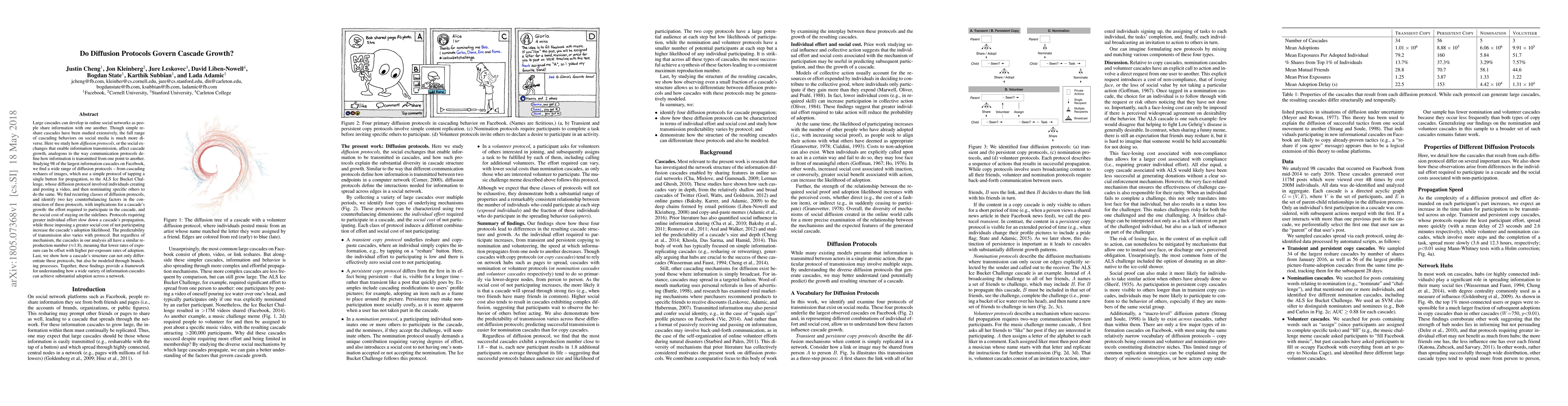 This paper investigates how different diffusion protocols influence the growth of information cascades on Facebook, identifying recurring classes of protocols based on effort and social cost. It reveals that while protocols requiring higher effort slow cascades, those imposing greater social costs boost adoption, with all analyzed cascades maintaining a similar reproduction number, indicating a balance between exposure and adoption rates.