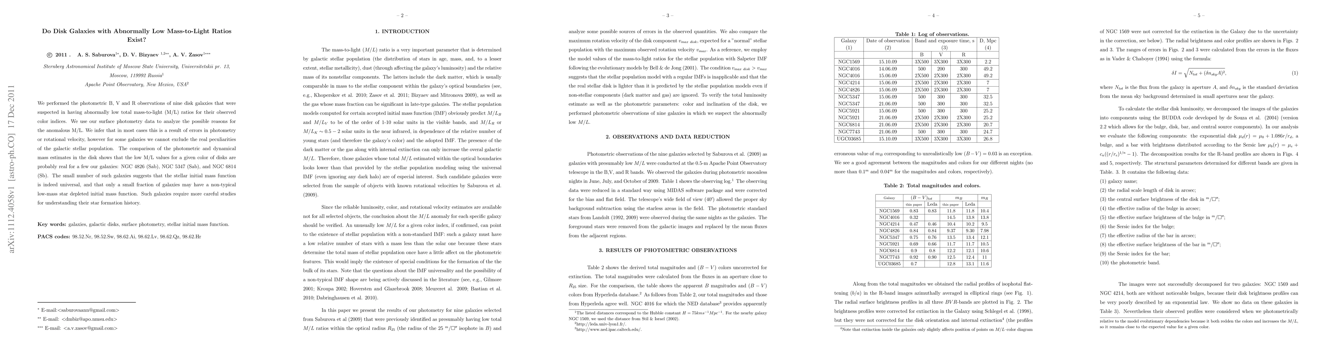 We performed the photometric B, V and R observations of nine disk galaxies that were suspected in having abnormally low total mass-to-light (M/L) ratios for their observed color indices. We use our surface photometry data to analyze the possible reasons for the anomalous M/L. We infer that in most cases this is a result of errors in photometry or rotational velocity, however for some galaxies we cannot exclude the real peculiarities of the galactic stellar population. The comparison of the photometric and dynamical mass estimates in the disk shows that the low M/L values for a given color of disks are probably real for a few our galaxies: NGC 4826 (Sab), NGC 5347 (Sab), and NGC 6814 (Sb). The small number of such galaxies suggests that the stellar initial mass function is indeed universal, and that only a small fraction of galaxies may have a non-typical low-mass star depleted initial mass function. Such galaxies require more careful studies for understanding their star formation history.