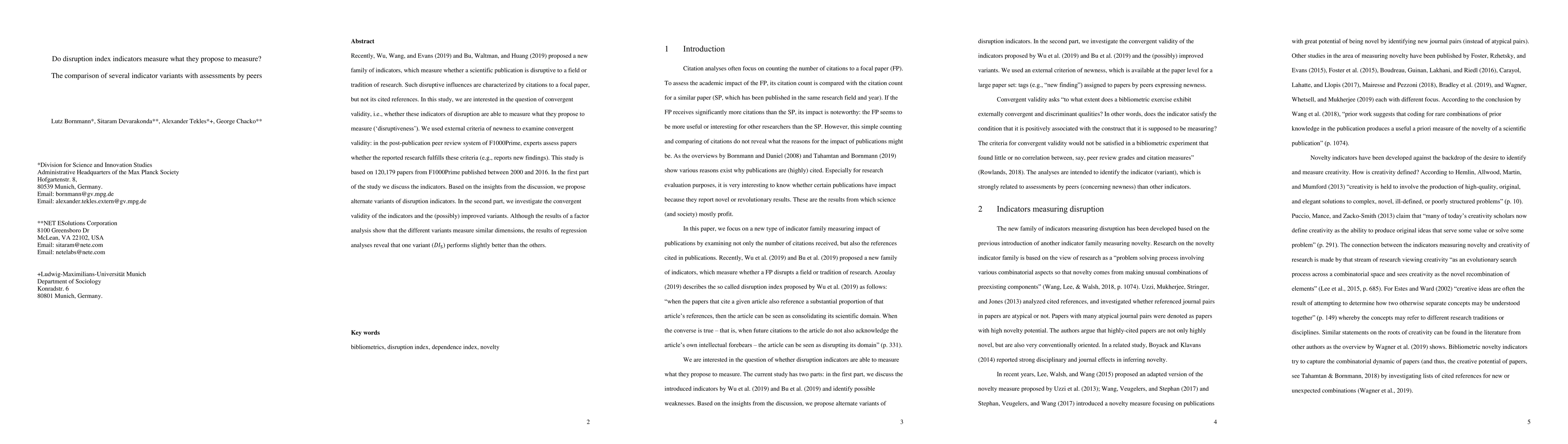 This paper examines the validity of new disruption index indicators proposed by Wu et al. (2019) and Bu et al. (2019) to measure scientific publications' disruptive influence. The study finds that while various indicator variants measure similar dimensions, the DI5 variant shows slightly better performance in assessing disruptiveness, as evaluated by peer assessments of newness in the F1000Prime post-publication review system.