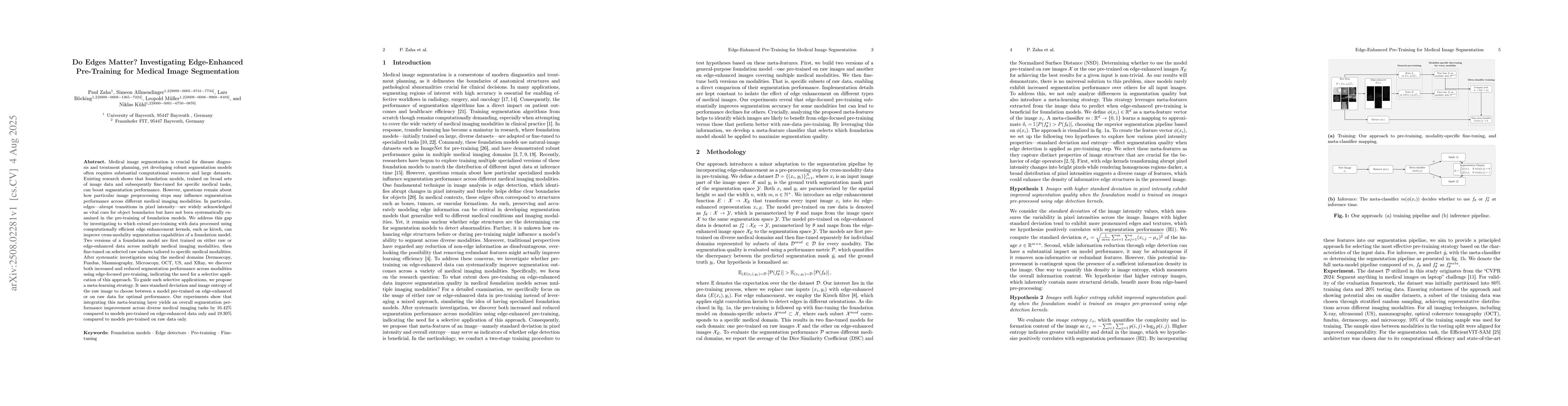 Medical image segmentation is crucial for disease diagnosis and treatment planning, yet developing robust segmentation models often requires substantial computational resources and large datasets. Existing research shows that pre-trained and finetuned foundation models can boost segmentation performance. However, questions remain about how particular image preprocessing steps may influence segmentation performance across different medical imaging modalities. In particular, edges-abrupt transitions in pixel intensity-are widely acknowledged as vital cues for object boundaries but have not been systematically examined in the pre-training of foundation models. We address this gap by investigating to which extend pre-training with data processed using computationally efficient edge kernels, such as kirsch, can improve cross-modality segmentation capabilities of a foundation model. Two versions of a foundation model are first trained on either raw or edge-enhanced data across multiple medical imaging modalities, then finetuned on selected raw subsets tailored to specific medical modalities. After systematic investigation using the medical domains Dermoscopy, Fundus, Mammography, Microscopy, OCT, US, and XRay, we discover both increased and reduced segmentation performance across modalities using edge-focused pre-training, indicating the need for a selective application of this approach. To guide such selective applications, we propose a meta-learning strategy. It uses standard deviation and image entropy of the raw image to choose between a model pre-trained on edge-enhanced or on raw data for optimal performance. Our experiments show that integrating this meta-learning layer yields an overall segmentation performance improvement across diverse medical imaging tasks by 16.42% compared to models pre-trained on edge-enhanced data only and 19.30% compared to models pre-trained on raw data only.