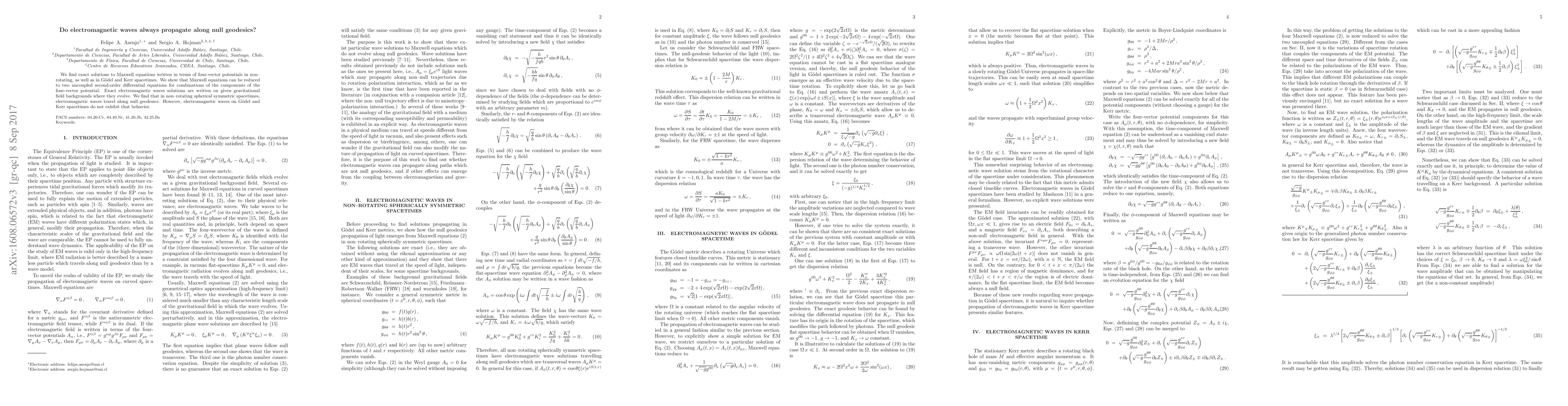We find exact solutions to Maxwell equations written in terms of four-vector potentials in non--rotating, as well as in G\"odel and Kerr spacetimes. We show that Maxwell equations can be reduced to two uncoupled second-order differential equations for combinations of the components of the four-vector potential. Exact electromagnetic waves solutions are written on given gravitational field backgrounds where they evolve. We find that in non--rotating spherical symmetric spacetimes, electromagnetic waves travel along null geodesics. However, electromagnetic waves on G\"odel and Kerr spacetimes do not exhibit that behavior.