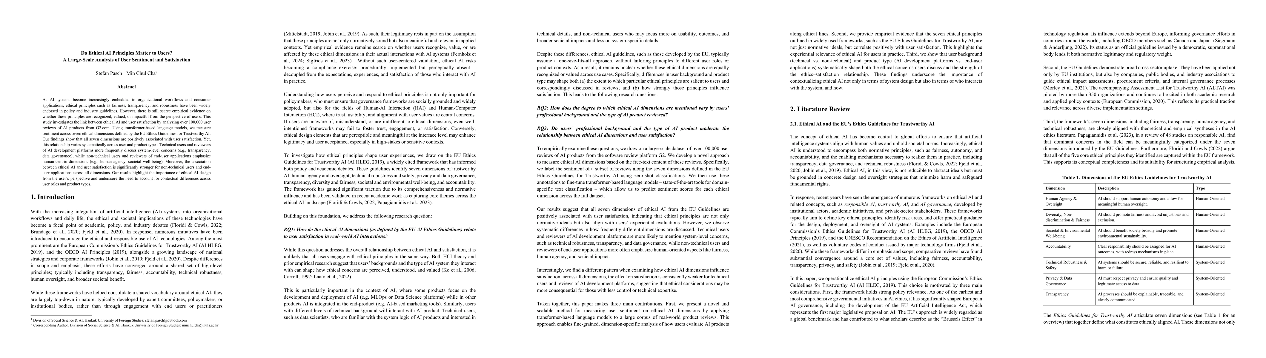 As AI systems become increasingly embedded in organizational workflows and consumer applications, ethical principles such as fairness, transparency, and robustness have been widely endorsed in policy and industry guidelines. However, there is still scarce empirical evidence on whether these principles are recognized, valued, or impactful from the perspective of users. This study investigates the link between ethical AI and user satisfaction by analyzing over 100,000 user reviews of AI products from G2. Using transformer-based language models, we measure sentiment across seven ethical dimensions defined by the EU Ethics Guidelines for Trustworthy AI. Our findings show that all seven dimensions are positively associated with user satisfaction. Yet, this relationship varies systematically across user and product types. Technical users and reviewers of AI development platforms more frequently discuss system-level concerns (e.g., transparency, data governance), while non-technical users and reviewers of end-user applications emphasize human-centric dimensions (e.g., human agency, societal well-being). Moreover, the association between ethical AI and user satisfaction is significantly stronger for non-technical users and end-user applications across all dimensions. Our results highlight the importance of ethical AI design from users' perspectives and underscore the need to account for contextual differences across user roles and product types.