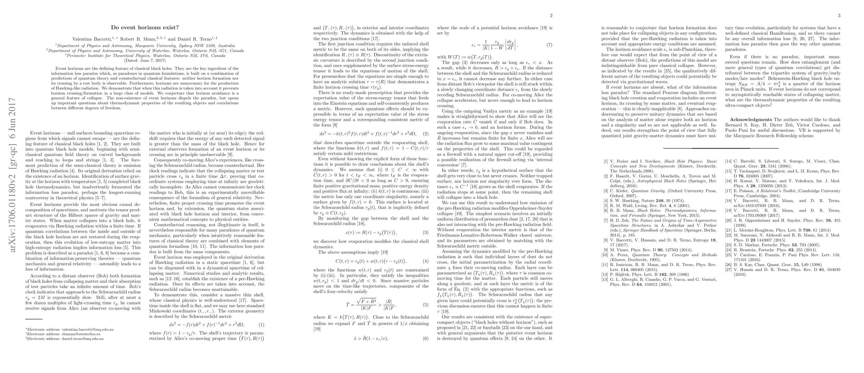 The paper argues that event horizons, central to classical black holes, may not exist due to the production of Hawking-like radiation, which prevents horizon formation or crossing. This conjecture resolves the information loss paradox but raises new questions about the thermodynamic properties and correlations of the resulting objects.