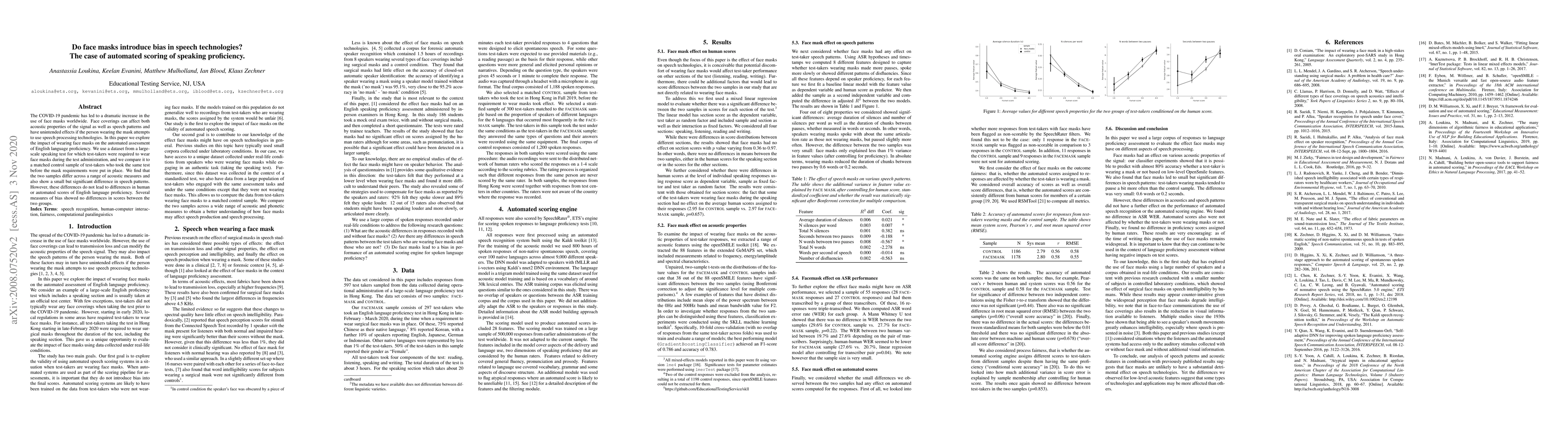This paper investigates whether face masks affect automated scoring of English language proficiency during speaking tests. It finds that while masks alter acoustic properties and speech patterns, they do not impact the final automated or human proficiency scores, indicating no significant bias introduced by mask-wearing.