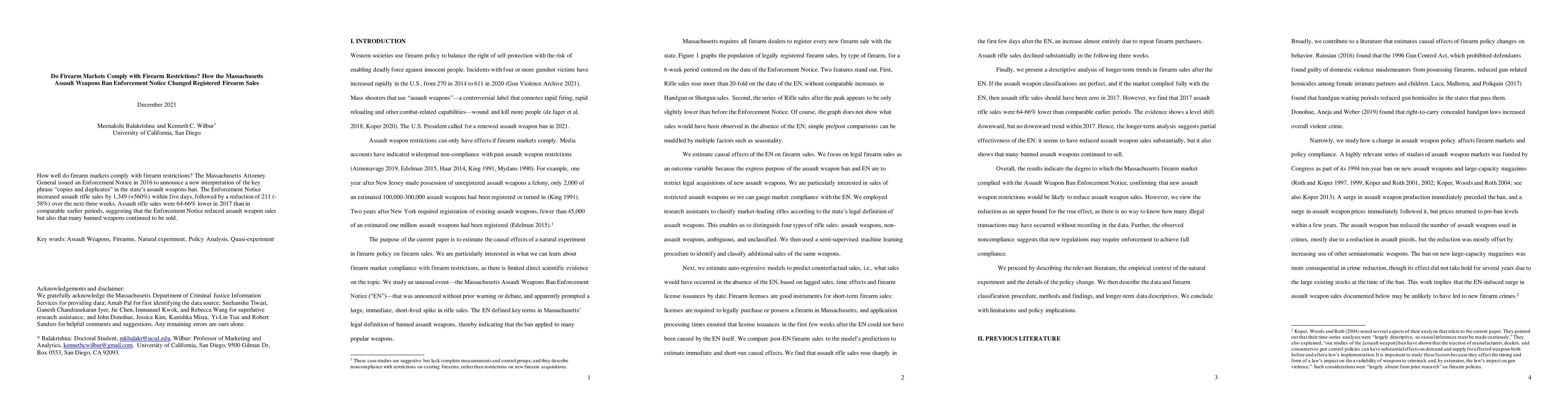 How well do firearm markets comply with firearm restrictions? The Massachusetts Attorney General issued an Enforcement Notice in 2016 to announce a new interpretation of the key phrase "copies and duplicates" in the state's assault weapons ban. The Enforcement Notice increased assault rifle sales by 1,349 (+560%) within five days, followed by a reduction of 211 (-58%) over the next three weeks. Assault rifle sales were 64-66% lower in 2017 than in comparable earlier periods, suggesting that the Enforcement Notice reduced assault weapon sales but also that many banned weapons continued to be sold.