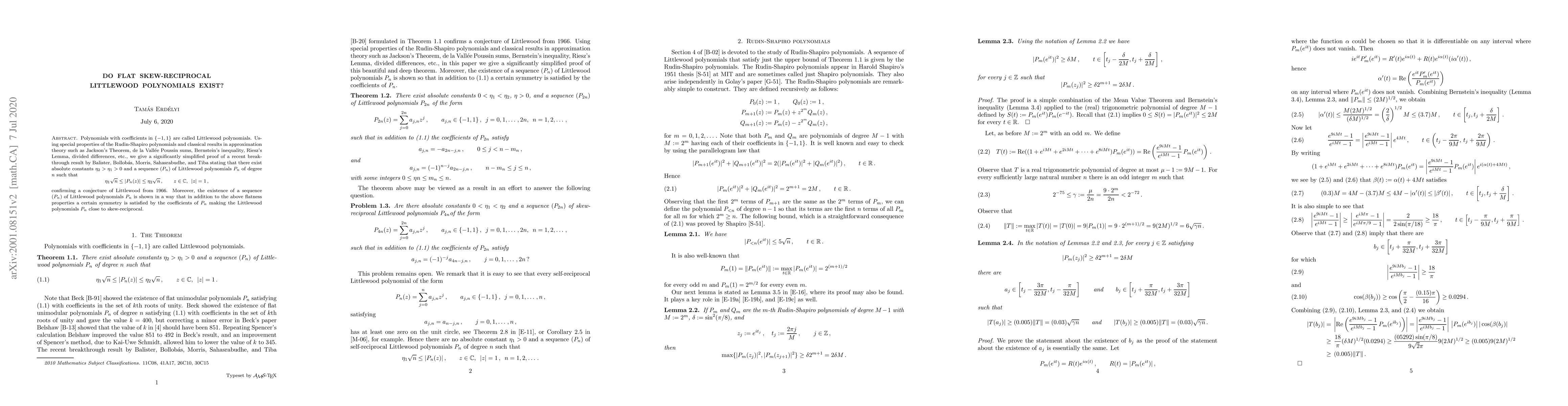 Polynomials with coefficients in $\{-1,1\}$ are called Littlewood polynomials. Using special properties of the Rudin-Shapiro polynomials and classical results in approximation theory such as Jackson's Theorem, de la Vall\'ee Poussin sums, Bernstein's inequality, Riesz's Lemma, divided differences, etc., we give a significantly simplified proof of a recent breakthrough result by Balister, Bollob\'as, Morris, Sahasrabudhe, and Tiba stating that there exist absolute constants $\eta_2 > \eta_1 > 0$ and a sequence $(P_n)$ of Littlewood polynomials $P_n$ of degree $n$ such that $$\eta_1 \sqrt{n} \leq |P_n(z)| \leq \eta_2 \sqrt{n}\,, \qquad z \in \mathbb{C}\,, \, \, |z| = 1,,$$ confirming a conjecture of Littlewood from 1966. Moreover, the existence of a sequence $(P_n)$ of Littlewood polynomials $P_n$ is shown in a way that in addition to the above flatness properties a certain symmetry is satisfied by the coefficients of $P_n$ making the Littlewood polynomials $P_n$ close to skew-reciprocal.
