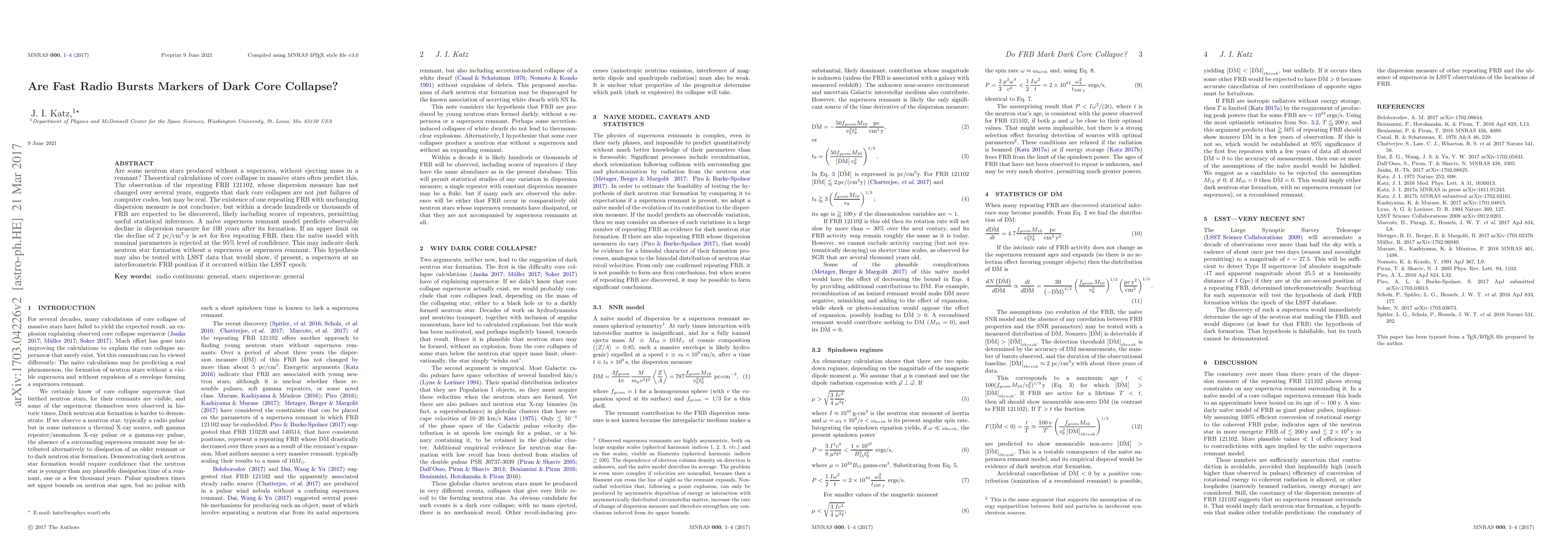 Are some neutron stars produced without a supernova, without ejecting mass in a remnant? Theoretical calculations of core collapse in massive stars often predict this. The observation of the repeating FRB 121102, whose dispersion measure has not changed over several years, suggests that dark core collapses are not just failures of computer codes, but may be real. The existence of one repeating FRB with unchanging dispersion measure is not conclusive, but within a decade hundreds or thousands of FRB are expected to be discovered, likely including scores of repeaters, permitting useful statistical inferences. A na\"{\i}ve supernova remnant model predicts observable decline in dispersion measure for 100 years after its formation. If an upper limit on the decline of 2 pc/cm$^3$-y is set for five repeating FRB, then the na\"{\i}ve model with nominal parameters is rejected at the 95\% level of confidence. This may indicate dark neutron star formation without a supernova or supernova remnant. This hypothesis may also be tested with LSST data that would show, if present, a supernova at an interferometric FRB position if it occurred within the LSST epoch.