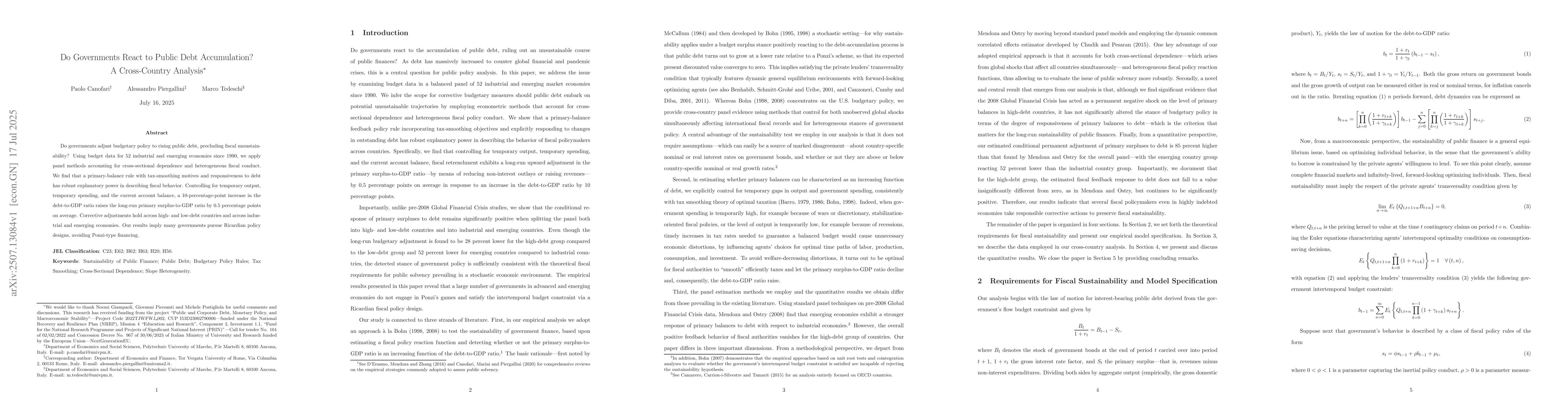Do governments adjust budgetary policy to rising public debt, precluding fiscal unsustainability? Using budget data for 52 industrial and emerging economies since 1990, we apply panel methods accounting for cross-sectional dependence and heterogeneous fiscal conduct. We find that a primary-balance rule with tax-smoothing motives and responsiveness to debt has robust explanatory power in describing fiscal behavior. Controlling for temporary output, temporary spending, and the current account balance, a 10-percentage-point increase in the debt-to-GDP ratio raises the long-run primary surplus-to-GDP ratio by 0.5 percentage points on average. Corrective adjustments hold across high- and low-debt countries and across industrial and emerging economies. Our results imply many governments pursue Ricardian policy designs, avoiding Ponzi-type financing.