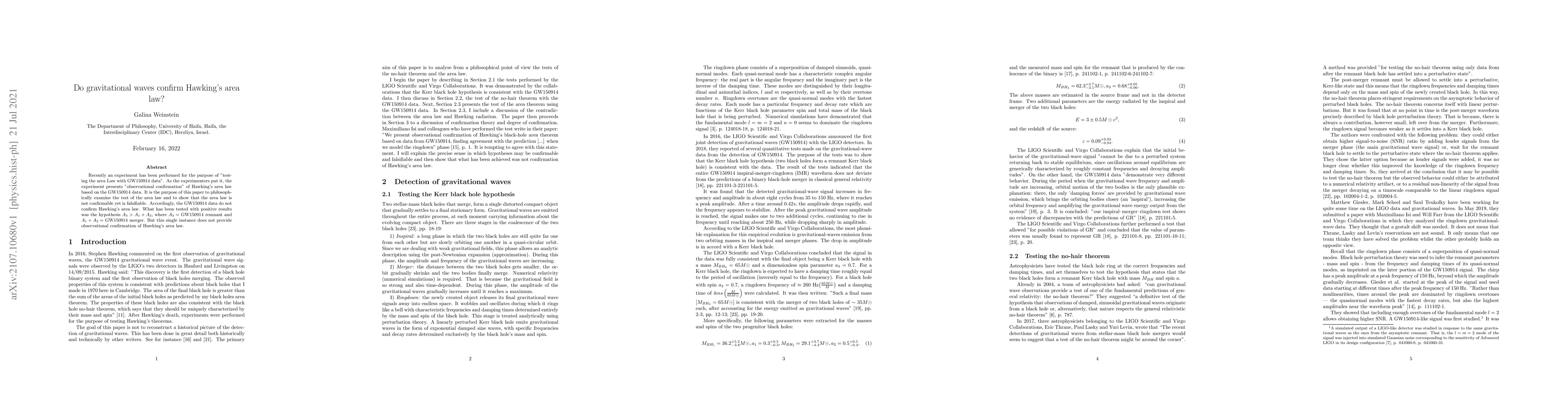 Research paper examines if gravitational waves confirm Hawking's area law, finding it falsifiable but not yet confirmed, as testing only validated a specific hypothesis rather than the full law.