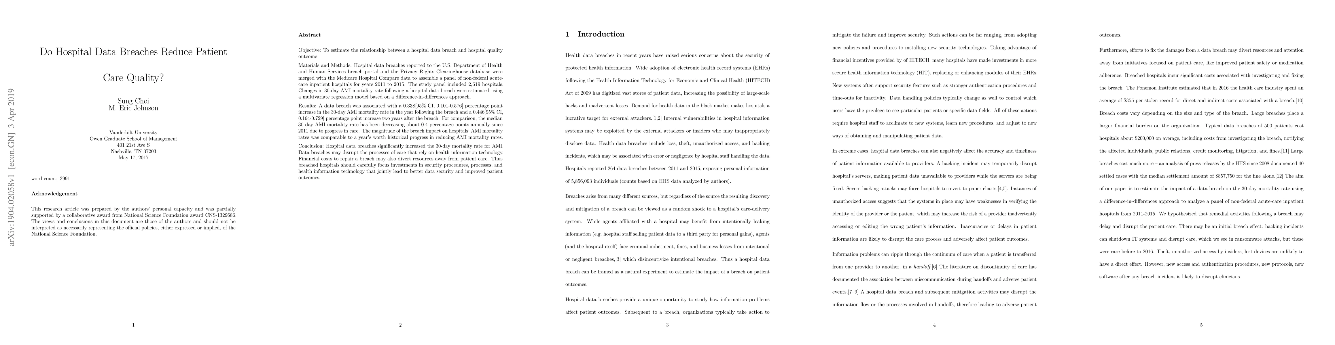 Objective: To estimate the relationship between a hospital data breach and hospital quality outcome Materials and Methods: Hospital data breaches reported to the U.S. Department of Health and Human Services breach portal and the Privacy Rights Clearinghouse database were merged with the Medicare Hospital Compare data to assemble a panel of non-federal acutecare inpatient hospitals for years 2011 to 2015. The study panel included 2,619 hospitals. Changes in 30-day AMI mortality rate following a hospital data breach were estimated using a multivariate regression model based on a difference-in-differences approach. Results: A data breach was associated with a 0.338[95% CI, 0.101-0.576] percentage point increase in the 30-day AMI mortality rate in the year following the breach and a 0.446[95% CI, 0.164-0.729] percentage point increase two years after the breach. For comparison, the median 30-day AMI mortality rate has been decreasing about 0.4 percentage points annually since 2011 due to progress in care. The magnitude of the breach impact on hospitals' AMI mortality rates was comparable to a year's worth historical progress in reducing AMI mortality rates. Conclusion: Hospital data breaches significantly increased the 30-day mortality rate for AMI. Data breaches may disrupt the processes of care that rely on health information technology. Financial costs to repair a breach may also divert resources away from patient care. Thus breached hospitals should carefully focus investments in security procedures, processes, and health information technology that jointly lead to better data security and improved patient outcomes.