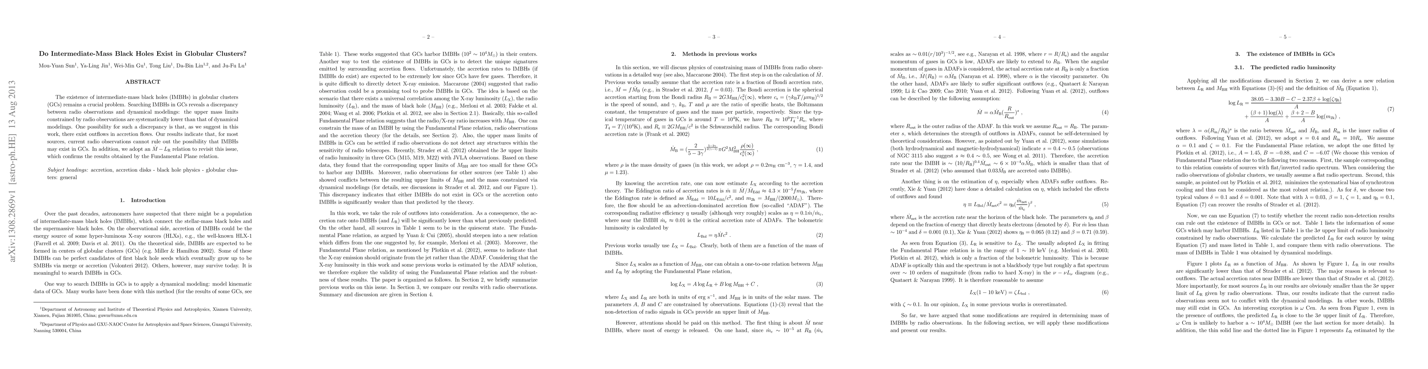 This paper investigates the existence of intermediate-mass black holes (IMBHs) in globular clusters (GCs), finding that current radio observations do not rule out their presence. The authors suggest that discrepancies between radio observations and dynamical modelings may be due to outflows in accretion flows, supported by an \dot{M}-L_{R} relation.