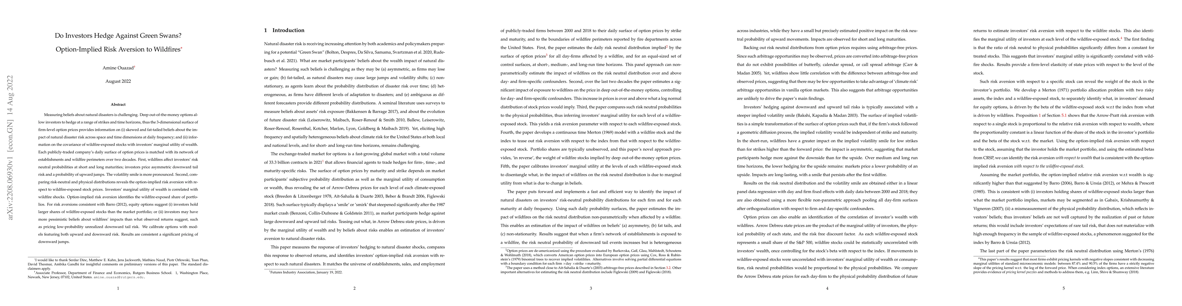 Measuring beliefs about natural disasters is challenging. Deep out-of-the-money options allow investors to hedge at a range of strikes and time horizons, thus the 3-dimensional surface of firm-level option prices provides information on (i) skewed and fat-tailed beliefs about the impact of natural disaster risk across space and time dimensions at daily frequency; and (ii) information on the covariance of wildfire-exposed stocks with investors' marginal utility of wealth. Each publicly-traded company's daily surface of option prices is matched with its network of establishments and wildfire perimeters over two decades. First, wildfires affect investors' risk neutral probabilities at short and long maturities; investors price asymmetric downward tail risk and a probability of upward jumps. The volatility smile is more pronounced. Second, comparing risk-neutral and physical distributions reveals the option-implied risk aversion with respect to wildfire-exposed stock prices. Investors' marginal utility of wealth is correlated with wildfire shocks. Option-implied risk aversion identifies the wildfire-exposed share of portfolios. For risk aversions consistent with Barro (2012), equity options suggest (i) investors hold larger shares of wildfire-exposed stocks than the market portfolio; or (ii) investors may have more pessimistic beliefs about wildfires' impacts than what observed returns suggest, such as pricing low-probability unrealized downward tail risk. We calibrate options with models featuring both upward and downward risk. Results are consistent a significant pricing of downward jumps.