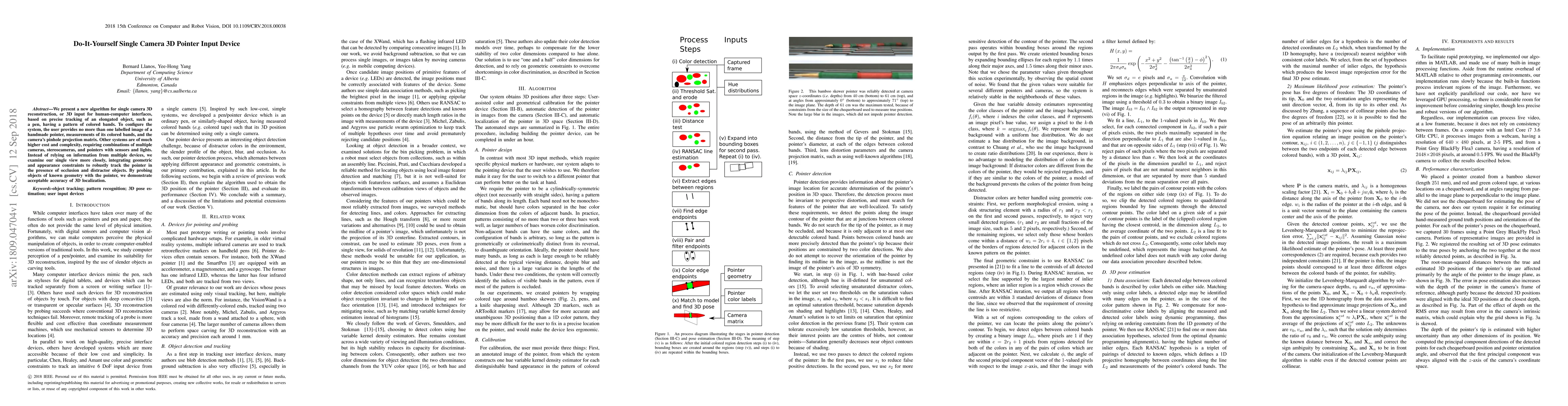 This paper introduces a cost-effective DIY single camera 3D pointer input device that tracks an elongated object with colored bands, requiring minimal setup. It achieves robust 3D reconstruction using geometric and appearance constraints, demonstrating accurate 3D localization without the need for multiple cameras or complex sensors.