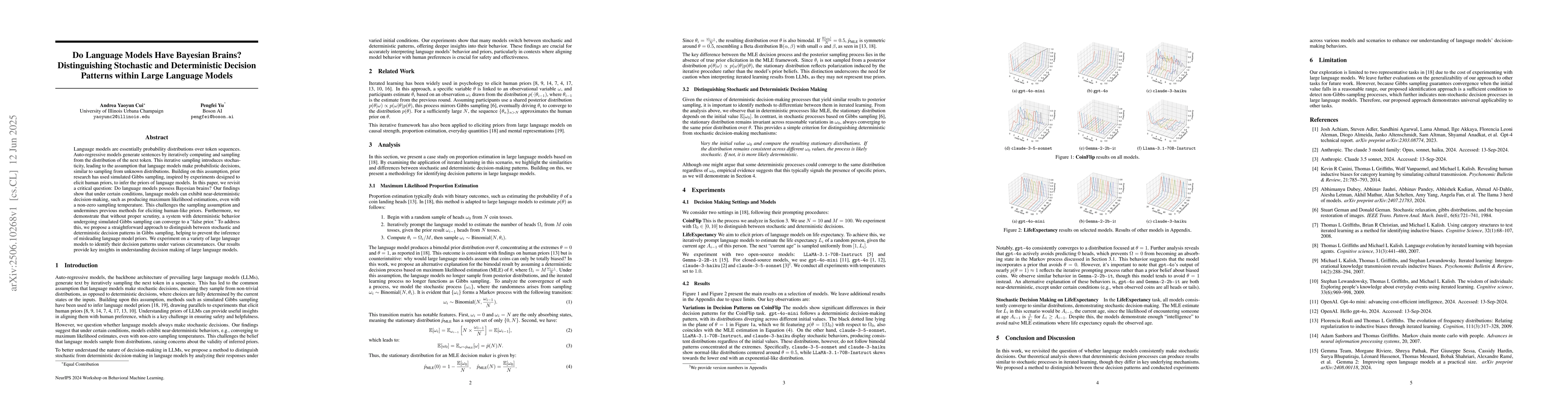 Language models are essentially probability distributions over token sequences. Auto-regressive models generate sentences by iteratively computing and sampling from the distribution of the next token. This iterative sampling introduces stochasticity, leading to the assumption that language models make probabilistic decisions, similar to sampling from unknown distributions. Building on this assumption, prior research has used simulated Gibbs sampling, inspired by experiments designed to elicit human priors, to infer the priors of language models. In this paper, we revisit a critical question: Do language models possess Bayesian brains? Our findings show that under certain conditions, language models can exhibit near-deterministic decision-making, such as producing maximum likelihood estimations, even with a non-zero sampling temperature. This challenges the sampling assumption and undermines previous methods for eliciting human-like priors. Furthermore, we demonstrate that without proper scrutiny, a system with deterministic behavior undergoing simulated Gibbs sampling can converge to a "false prior." To address this, we propose a straightforward approach to distinguish between stochastic and deterministic decision patterns in Gibbs sampling, helping to prevent the inference of misleading language model priors. We experiment on a variety of large language models to identify their decision patterns under various circumstances. Our results provide key insights in understanding decision making of large language models.