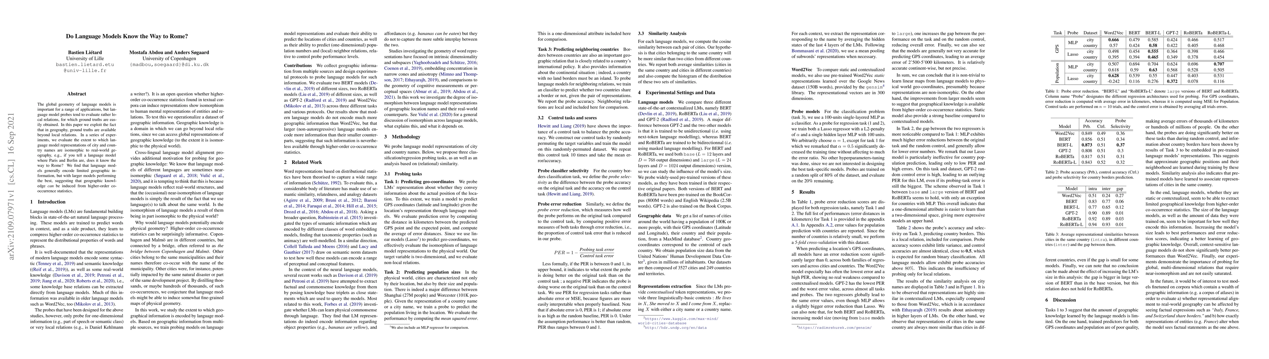 The global geometry of language models is important for a range of applications, but language model probes tend to evaluate rather local relations, for which ground truths are easily obtained. In this paper we exploit the fact that in geography, ground truths are available beyond local relations. In a series of experiments, we evaluate the extent to which language model representations of city and country names are isomorphic to real-world geography, e.g., if you tell a language model where Paris and Berlin are, does it know the way to Rome? We find that language models generally encode limited geographic information, but with larger models performing the best, suggesting that geographic knowledge can be induced from higher-order co-occurrence statistics.