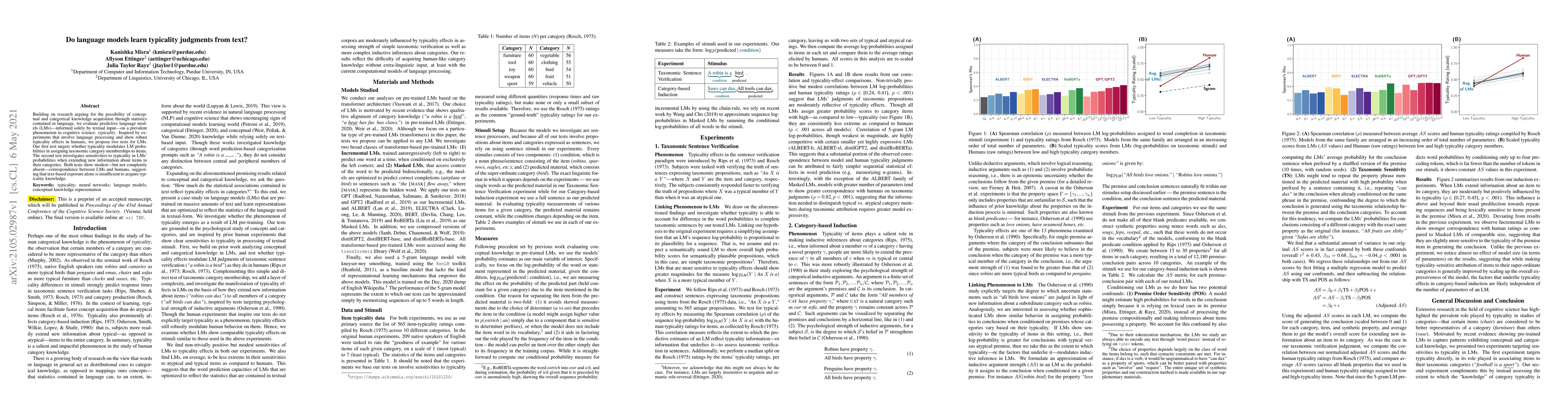 Research investigates if language models (LMs) learn typicality judgments from text, testing their ability to assign taxonomic categories and extend new information based on typicality. Results show only modest alignment with human typicality judgments, indicating text alone is insufficient for acquiring such knowledge.