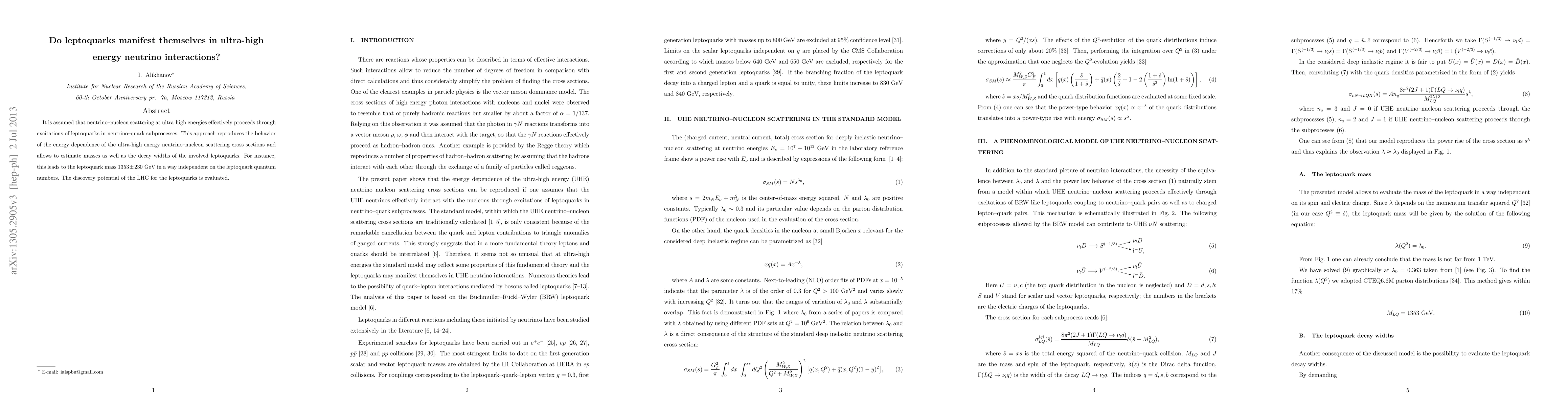 It is assumed that neutrino-nucleon scattering at ultra-high energies effectively proceeds through excitations of leptoquarks in neutrino-quark subprocesses. This approach reproduces the behavior of the energy dependence of the ultra-high energy neutrino-nucleon scattering cross sections and allows to estimate masses as well as the decay widths of the involved leptoquarks. For instance, this leads to the leptoquark mass $1353\pm230$ GeV in a way independent on the leptoquark quantum numbers. The discovery potential of the LHC for the leptoquarks is evaluated.