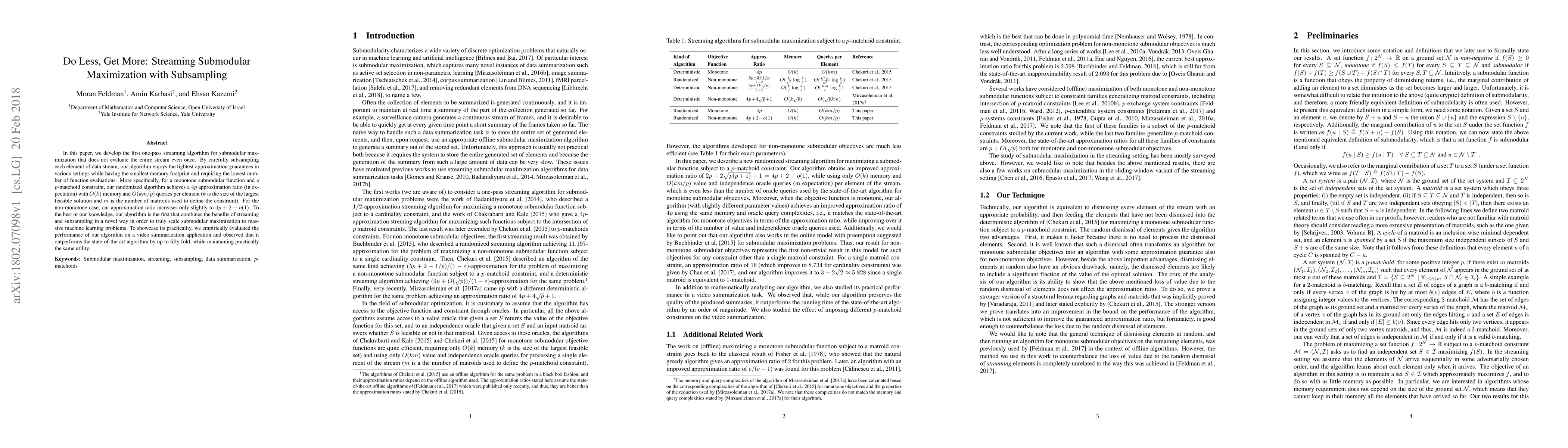 A new algorithm improves submodular maximization for massive machine learning problems by subsampling data streams, achieving a $4p$ approximation ratio with low memory usage and query count.