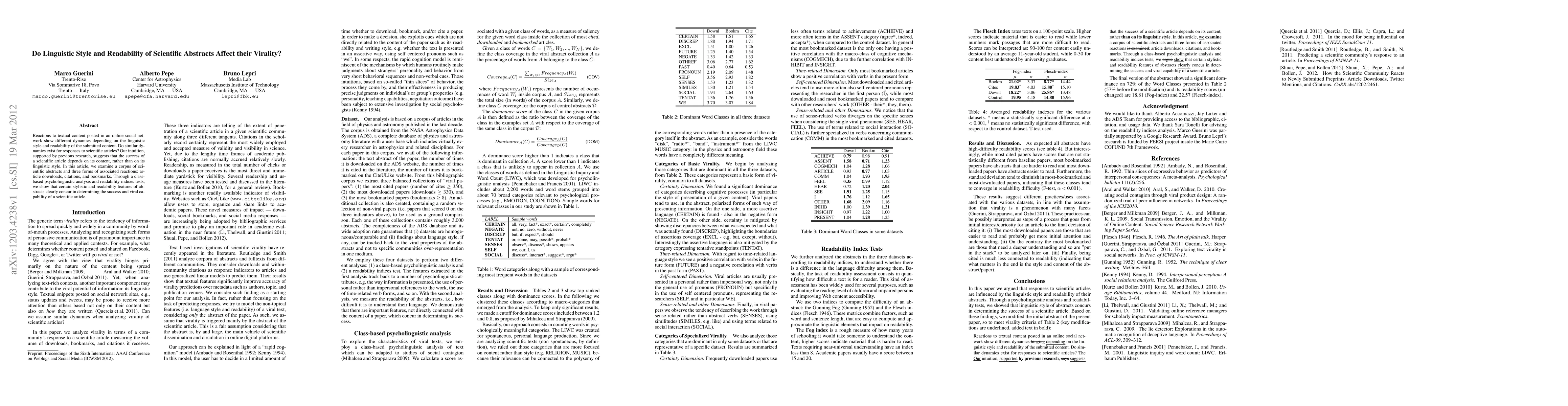 Reactions to textual content posted in an online social network show different dynamics depending on the linguistic style and readability of the submitted content. Do similar dynamics exist for responses to scientific articles? Our intuition, supported by previous research, suggests that the success of a scientific article depends on its content, rather than on its linguistic style. In this article, we examine a corpus of scientific abstracts and three forms of associated reactions: article downloads, citations, and bookmarks. Through a class-based psycholinguistic analysis and readability indices tests, we show that certain stylistic and readability features of abstracts clearly concur in determining the success and viral capability of a scientific article.