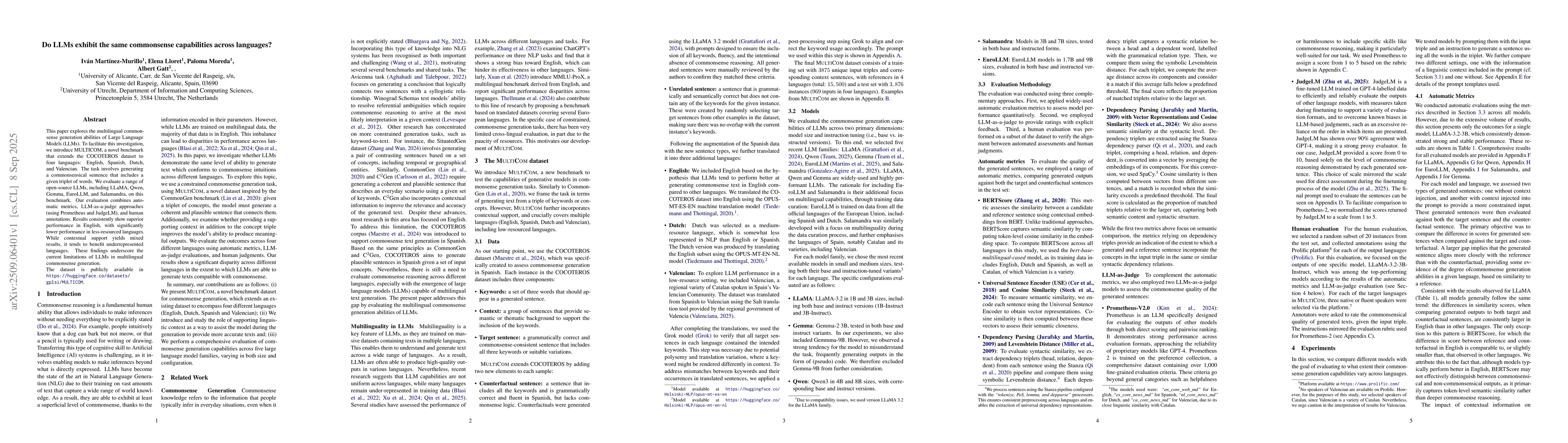 This paper explores the multilingual commonsense generation abilities of Large Language Models (LLMs). To facilitate this investigation, we introduce MULTICOM, a novel benchmark that extends the COCOTEROS dataset to four languages: English, Spanish, Dutch, and Valencian. The task involves generating a commonsensical sentence that includes a given triplet of words. We evaluate a range of open-source LLMs, including LLaMA, Qwen, Gemma, EuroLLM, and Salamandra, on this benchmark. Our evaluation combines automatic metrics, LLM-as-a-judge approaches (using Prometheus and JudgeLM), and human annotations. Results consistently show superior performance in English, with significantly lower performance in less-resourced languages. While contextual support yields mixed results, it tends to benefit underrepresented languages. These findings underscore the current limitations of LLMs in multilingual commonsense generation. The dataset is publicly available at https://huggingface.co/datasets/gplsi/MULTICOM.
