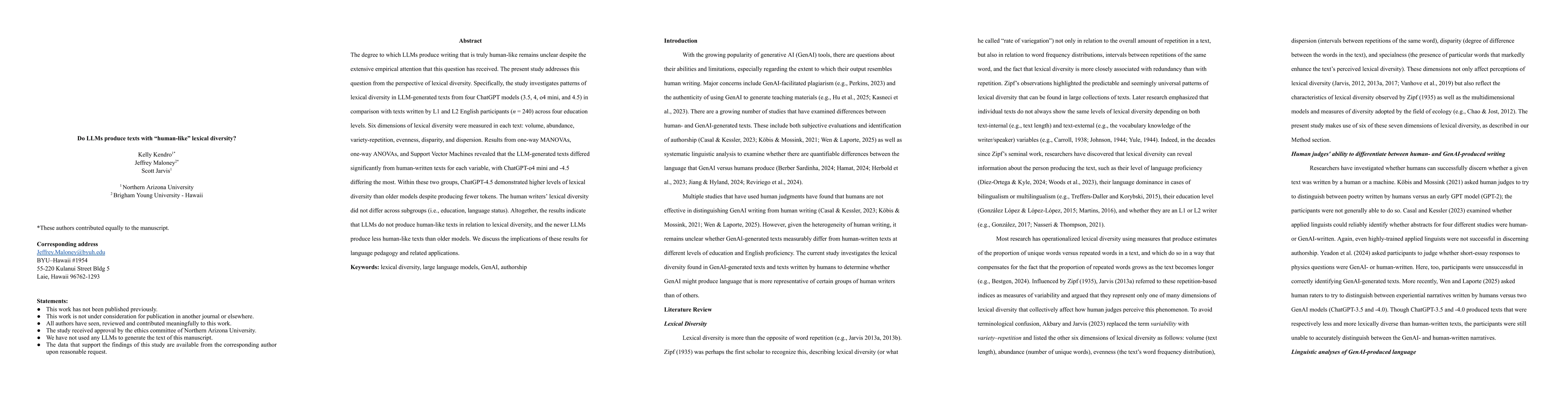 The degree to which LLMs produce writing that is truly human-like remains unclear despite the extensive empirical attention that this question has received. The present study addresses this question from the perspective of lexical diversity. Specifically, the study investigates patterns of lexical diversity in LLM-generated texts from four ChatGPT models (-3.5, -4, -o4 mini, and -4.5) in comparison with texts written by L1 and L2 English participants (n = 240) across four education levels. Six dimensions of lexical diversity were measured in each text: volume, abundance, variety-repetition, evenness, disparity, and dispersion. Results from one-way MANOVAs, one-way ANOVAS, and Support Vector Machines revealed that the LLM-generated texts differed significantly from human-written texts for each variable, with ChatGPT-o4 mini and -4.5 differing the most. Within these two groups, ChatGPT-4.5 demonstrated higher levels of lexical diversity despite producing fewer tokens. The human writers' lexical diversity did not differ across subgroups (i.e., education, language status). Altogether, the results indicate that LLMs do not produce human-like texts in relation to lexical diversity, and the newer LLMs produce less human-like texts than older models. We discuss the implications of these results for language pedagogy and related applications.