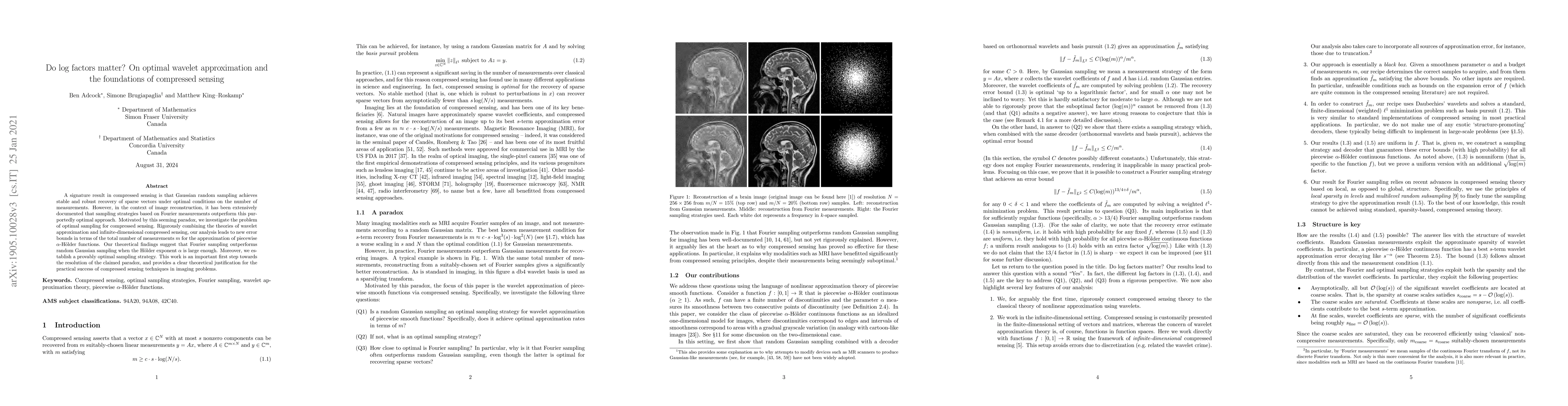This paper investigates the paradox where Fourier sampling outperforms Gaussian random sampling in image reconstruction despite theoretical optimality claims. By combining wavelet approximation and compressed sensing theories, it provides new error bounds and establishes a provably optimal sampling strategy, suggesting Fourier sampling is superior for large H\"older exponents.