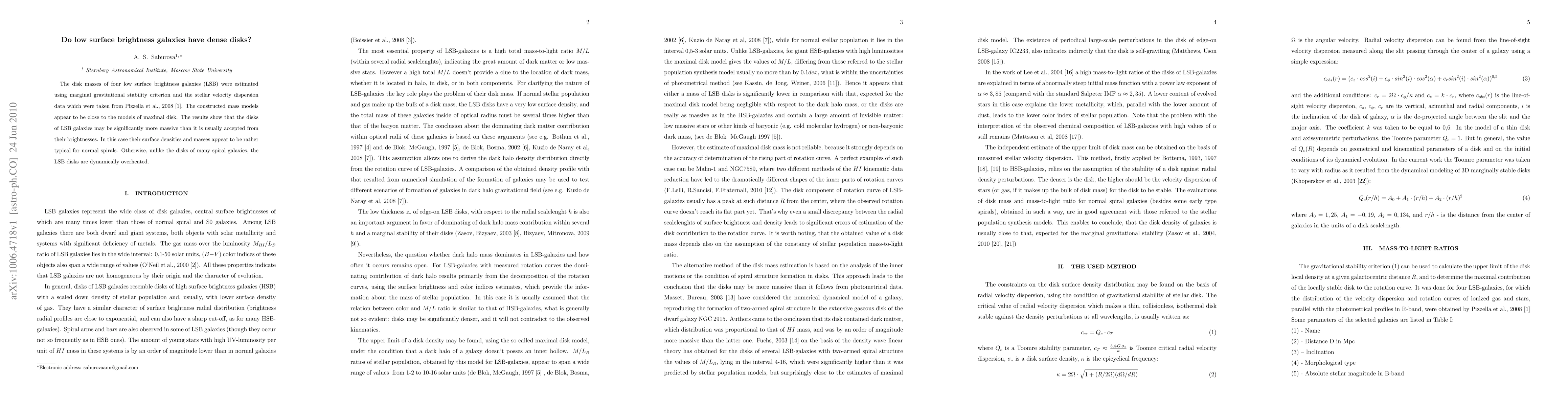 The paper presents a method to estimate disk masses of LSB galaxies using the marginal gravitational stability criterion, revealing that their disks might be more massive and less overheated than previously thought.
