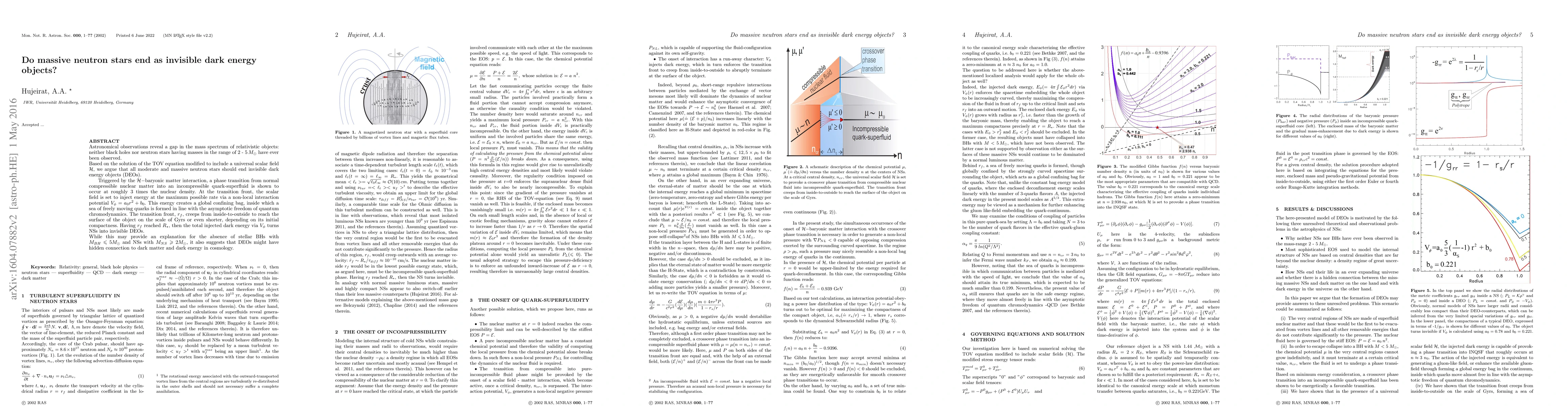 Astronomical observations reveal a gap in the mass spectrum of relativistic objects: neither black holes nor neutron stars having masses in the range of 2 - 5$\,\MSun$ have ever been observed. Based on the solution of the TOV equation modified to include a universal scalar field $\cal{H},$ we argue that all moderate and massive neutron stars should end invisible dark energy objects (DEOs). Triggered by the $\cal{H}-$baryonic matter interaction, a phase transition from normal compressible nuclear matter into an incompressible quark-superfluid is shown to occur at roughly $3$ times the nuclear density. At the transition front, the scalar field is set to inject energy at the maximum possible rate via a non-local interaction potential $V_\phi = a_0 r^2 + b_0.$ This energy creates a global confining bag, inside which a sea of freely moving quarks is formed in line with the asymptotic freedom of quantum chromodynamics. The transition front, $r_f,$ creeps from inside-to-outside to reach the surface of the object on the scale of Gyrs or even shorter, depending on its initial compactness. Having $r_f$ reached $R_\star,$ then the total injected dark energy via $V_\phi $ turns NSs into invisible DEOs. While this may provide an explanation for the absence of stellar BHs with $M_{BH}\leq 5 \MSun$ and NSs with $M_{NS}\geq 2 \MSun$, it also suggests that DEOs might have hidden connection to dark matter and dark energy in cosmology.