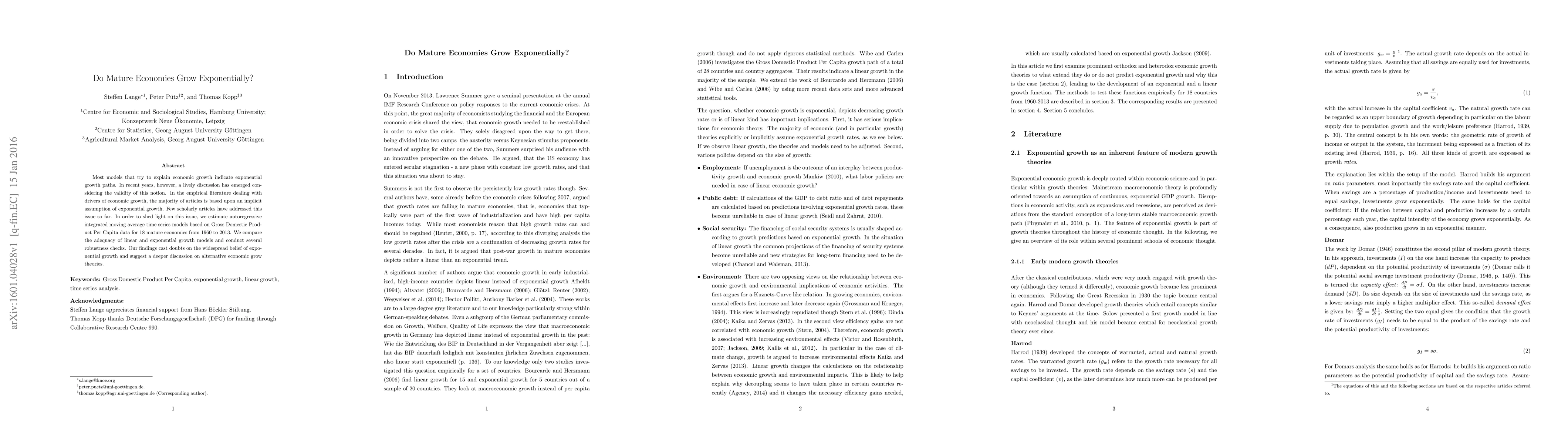 Most models that try to explain economic growth indicate exponential growth paths. In recent years, however, a lively discussion has emerged considering the validity of this notion. In the empirical literature dealing with drivers of economic growth, the majority of articles is based upon an implicit assumption of exponential growth. Few scholarly articles have addressed this issue so far. In order to shed light on this issue, we estimate autoregressive integrated moving average time series models based on Gross Domestic Product Per Capita data for 18 mature economies from 1960 to 2013. We compare the adequacy of linear and exponential growth models and conduct several robustness checks. Our fndings cast doubts on the widespread belief of exponential growth and suggest a deeper discussion on alternative economic grow theories.
