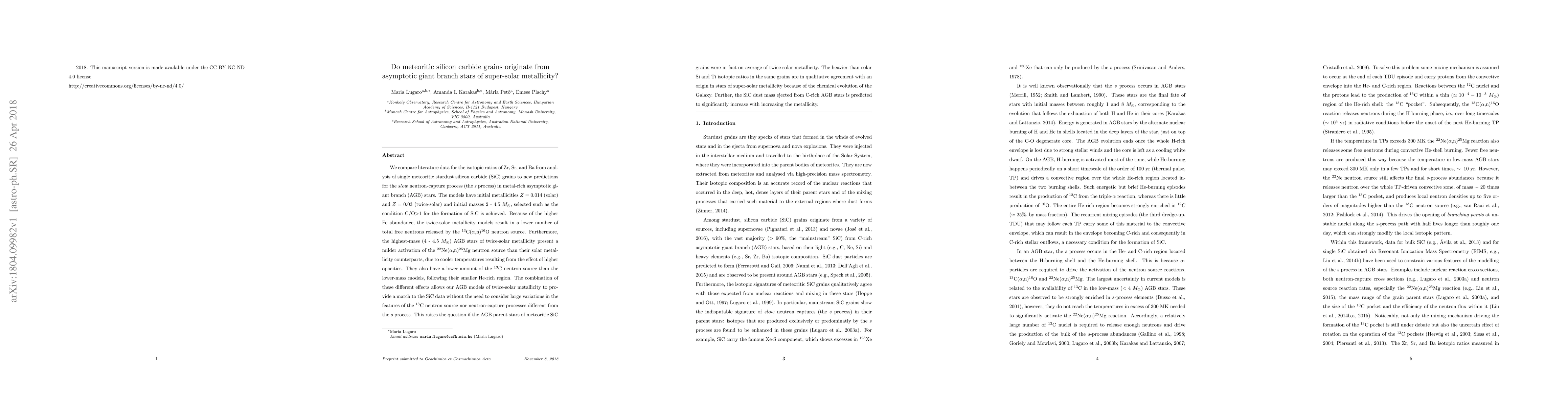 This paper investigates whether meteoritic silicon carbide grains originate from asymptotic giant branch stars with super-solar metallicity. The study finds that AGB stars with twice-solar metallicity can match the isotopic ratios of Zr, Sr, Ba, Si, and Ti in SiC grains, suggesting these stars may be the progenitors of the grains.