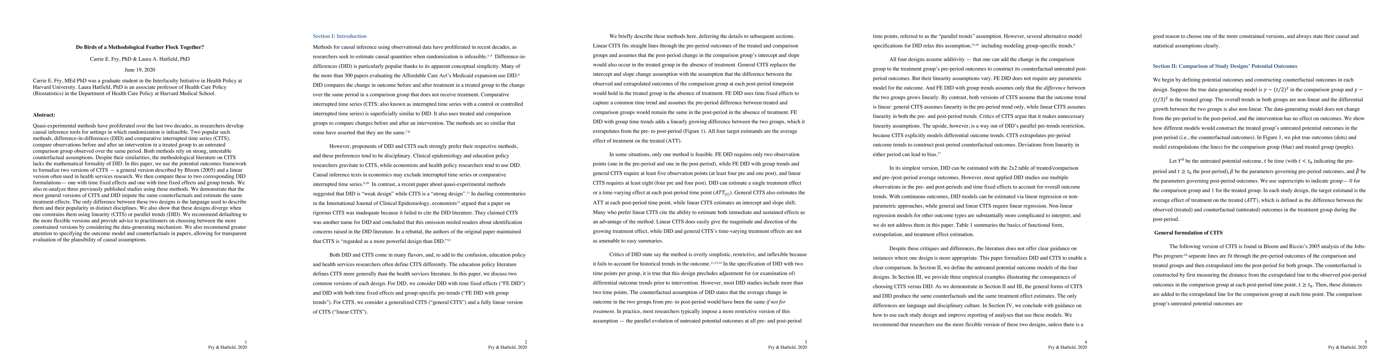 Quasi-experimental methods have proliferated over the last two decades, as researchers develop causal inference tools for settings in which randomization is infeasible. Two popular such methods, difference-in-differences (DID) and comparative interrupted time series (CITS), compare observations before and after an intervention in a treated group to an untreated comparison group observed over the same period. Both methods rely on strong, untestable counterfactual assumptions. Despite their similarities, the methodological literature on CITS lacks the mathematical formality of DID. In this paper, we use the potential outcomes framework to formalize two versions of CITS - a general version described by Bloom (2005) and a linear version often used in health services research. We then compare these to two corresponding DID formulations - one with time fixed effects and one with time fixed effects and group trends. We also re-analyze three previously published studies using these methods. We demonstrate that the most general versions of CITS and DID impute the same counterfactuals and estimate the same treatment effects. The only difference between these two designs is the language used to describe them and their popularity in distinct disciplines. We also show that these designs diverge when one constrains them using linearity (CITS) or parallel trends (DID). We recommend defaulting to the more flexible versions and provide advice to practitioners on choosing between the more constrained versions by considering the data-generating mechanism. We also recommend greater attention to specifying the outcome model and counterfactuals in papers, allowing for transparent evaluation of the plausibility of causal assumptions.