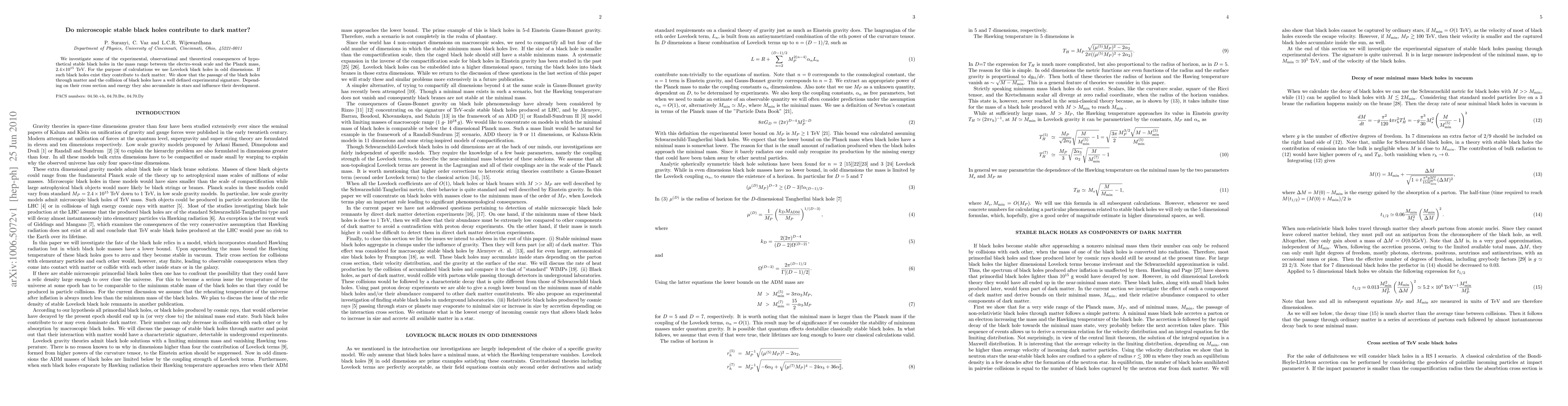 We investigate some of the experimental, observational and theoretical consequences of hypothetical stable black holes in the mass range between the electro-weak scale and the Planck mass, 2.4$\times 10^{15}$ TeV. For the purpose of calculations we use Lovelock black holes in odd dimensions. If such black holes exist they contribute to dark matter. We show that the passage of the black holes through matter and the collision of black holes have a well defined experimental signature. Depending on their cross section and energy they also accumulate in stars and influence their development.