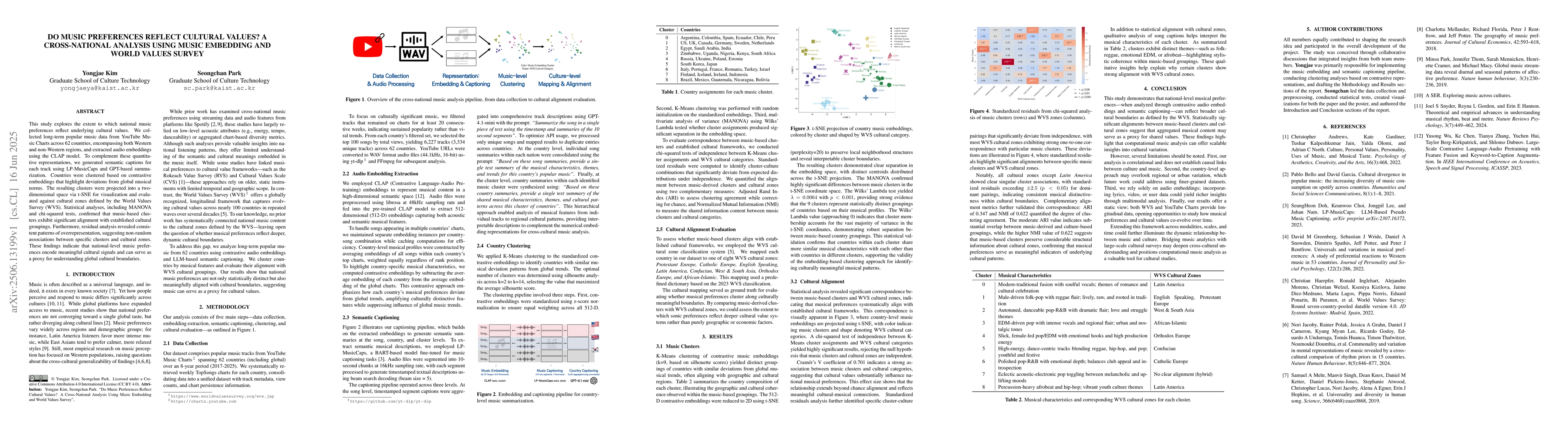 This study explores the extent to which national music preferences reflect underlying cultural values. We collected long-term popular music data from YouTube Music Charts across 62 countries, encompassing both Western and non-Western regions, and extracted audio embeddings using the CLAP model. To complement these quantitative representations, we generated semantic captions for each track using LP-MusicCaps and GPT-based summarization. Countries were clustered based on contrastive embeddings that highlight deviations from global musical norms. The resulting clusters were projected into a two-dimensional space via t-SNE for visualization and evaluated against cultural zones defined by the World Values Survey (WVS). Statistical analyses, including MANOVA and chi-squared tests, confirmed that music-based clusters exhibit significant alignment with established cultural groupings. Furthermore, residual analysis revealed consistent patterns of overrepresentation, suggesting non-random associations between specific clusters and cultural zones. These findings indicate that national-level music preferences encode meaningful cultural signals and can serve as a proxy for understanding global cultural boundaries.