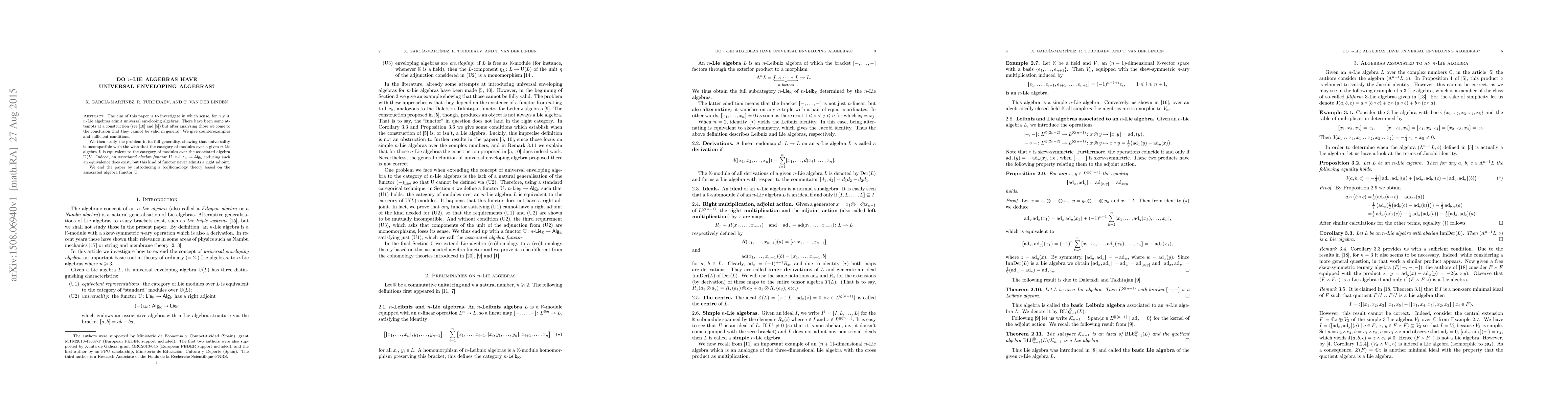 The aim of this paper is to investigate in which sense, for $n\geq 3$, $n$-Lie algebras admit universal enveloping algebras. There have been some attempts at a construction (see [10] and [5]) but after analysing those we come to the conclusion that they cannot be valid in general. We give counterexamples and sufficient conditions. We then study the problem in its full generality, showing that universality is incompatible with the wish that the category of modules over a given $n$-Lie algebra $L$ is equivalent to the category of modules over the associated algebra $U(L)$. Indeed, an associated algebra functor $U \colon \text{$n$-}\mathsf{Lie}_{\mathbb{K}} \to \mathsf{Alg}_{\mathbb{K}}$ inducing such an equivalence does exist, but this kind of functor never admits a right adjoint. We end the paper by introducing a (co)homology theory based on the associated algebra functor $U$.