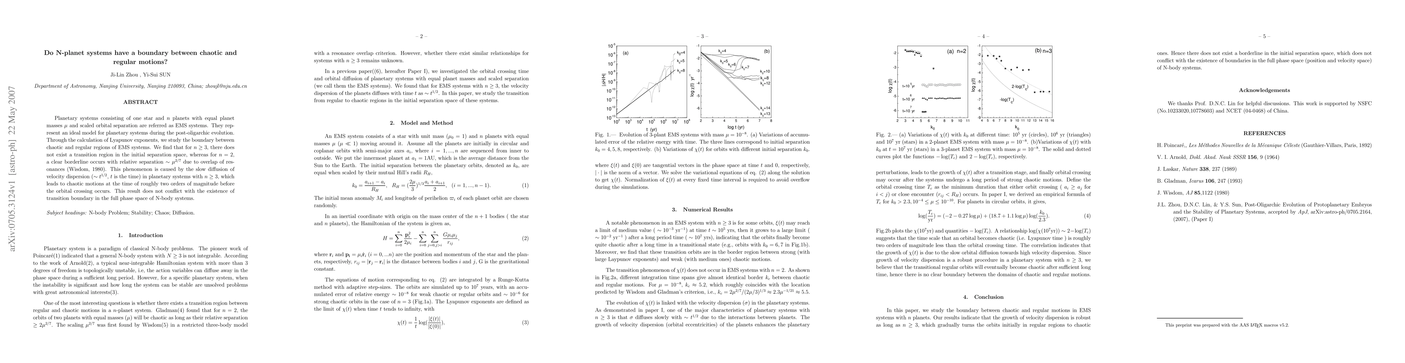 This study investigates the boundary between chaotic and regular motions in equal-mass multi-planet systems (EMS). For n > 2 planets, no clear transition region exists, while for n=2, a distinct boundary emerges due to resonance overlap. The chaotic behavior in larger systems occurs long before orbital crossings.