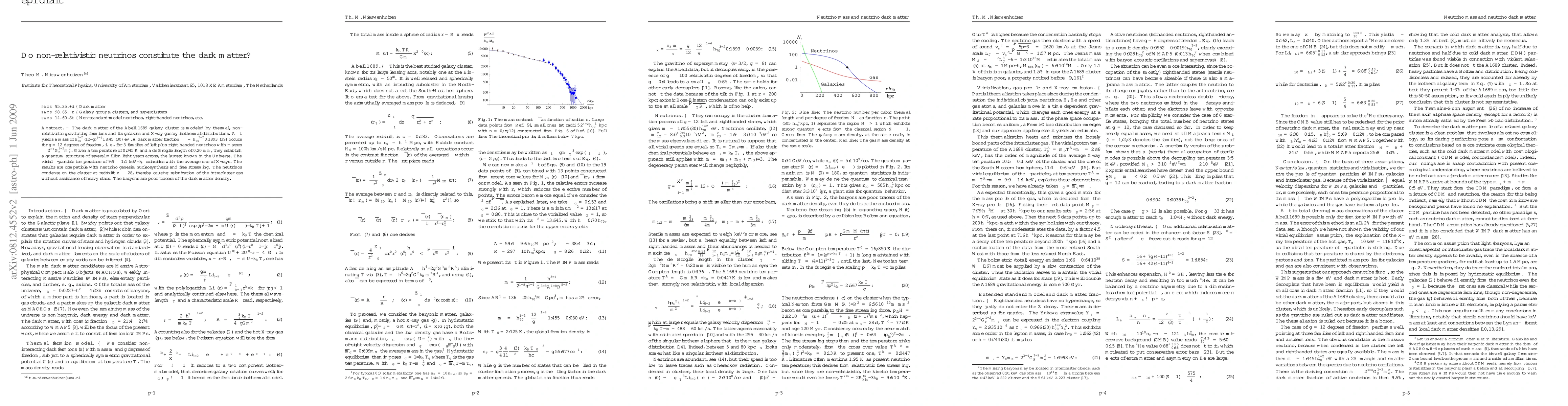 The dark matter of the Abell 1689 galaxy cluster is modeled by thermal, non-relativistic gravitating fermions and its galaxies and X-ray gas by isothermal distributions. A fit yields a mass of $h_{70}^{1/2}(12/{\overline g})^{1/4}$1.445 $(30)$ eV. A dark matter fraction $\Omega_\nu=h_{70}^{-3/2}0.1893$ $(39)$ occurs for ${\overline g}=12$ degrees of freedom, i. e., for 3 families of left plus right handed neutrinos with masses $\approx 2^{3/4}G_F^{1/2}m_e^2$. Given a temperature of 0.045 K and a de Broglie length of 0.20 mm, they establish a quantum structure of several million light years across, the largest known in the Universe. The virial $\alpha$-particle temperature of $9.9\pm1.1$ keV$/k_B$ coincides with the average one of X-rays. The results are compatible with neutrino genesis, nucleosynthesis and free streaming. The neutrinos condense on the cluster at redshift $z\sim 28$, thereby causing reionization of the intracluster gas without assistance of heavy stars. The baryons are poor tracers of the dark matter density.