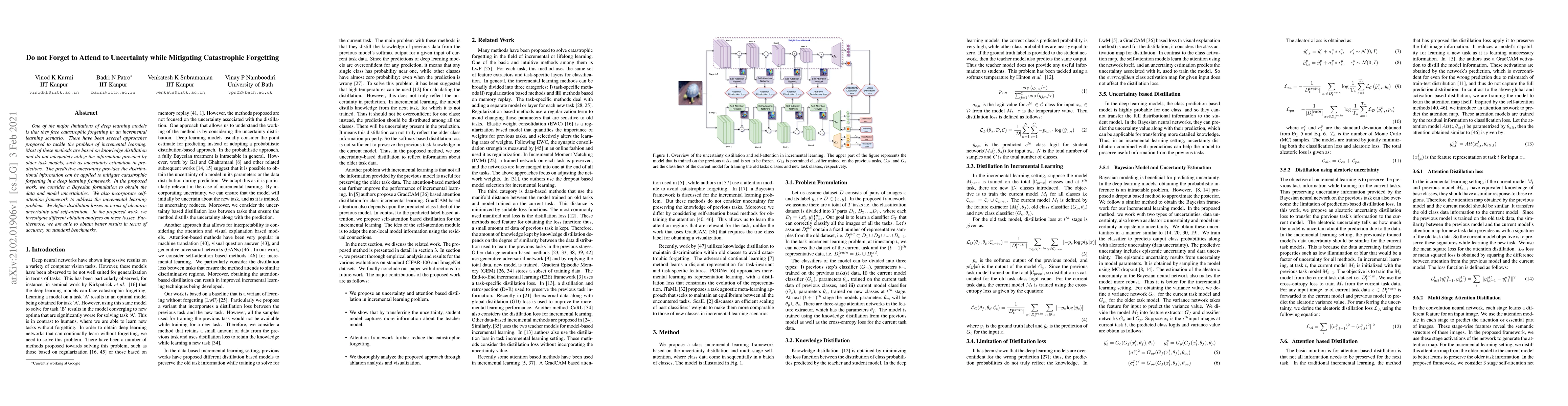 One of the major limitations of deep learning models is that they face catastrophic forgetting in an incremental learning scenario. There have been several approaches proposed to tackle the problem of incremental learning. Most of these methods are based on knowledge distillation and do not adequately utilize the information provided by older task models, such as uncertainty estimation in predictions. The predictive uncertainty provides the distributional information can be applied to mitigate catastrophic forgetting in a deep learning framework. In the proposed work, we consider a Bayesian formulation to obtain the data and model uncertainties. We also incorporate self-attention framework to address the incremental learning problem. We define distillation losses in terms of aleatoric uncertainty and self-attention. In the proposed work, we investigate different ablation analyses on these losses. Furthermore, we are able to obtain better results in terms of accuracy on standard benchmarks.