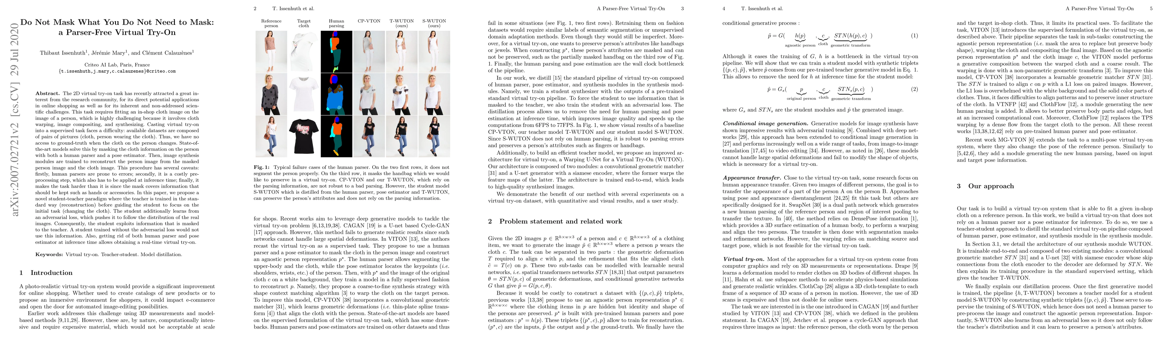 The 2D virtual try-on task has recently attracted a great interest from the research community, for its direct potential applications in online shopping as well as for its inherent and non-addressed scientific challenges. This task requires fitting an in-shop cloth image on the image of a person, which is highly challenging because it involves cloth warping, image compositing, and synthesizing. Casting virtual try-on into a supervised task faces a difficulty: available datasets are composed of pairs of pictures (cloth, person wearing the cloth). Thus, we have no access to ground-truth when the cloth on the person changes. State-of-the-art models solve this by masking the cloth information on the person with both a human parser and a pose estimator. Then, image synthesis modules are trained to reconstruct the person image from the masked person image and the cloth image. This procedure has several caveats: firstly, human parsers are prone to errors; secondly, it is a costly pre-processing step, which also has to be applied at inference time; finally, it makes the task harder than it is since the mask covers information that should be kept such as hands or accessories. In this paper, we propose a novel student-teacher paradigm where the teacher is trained in the standard way (reconstruction) before guiding the student to focus on the initial task (changing the cloth). The student additionally learns from an adversarial loss, which pushes it to follow the distribution of the real images. Consequently, the student exploits information that is masked to the teacher. A student trained without the adversarial loss would not use this information. Also, getting rid of both human parser and pose estimator at inference time allows obtaining a real-time virtual try-on.