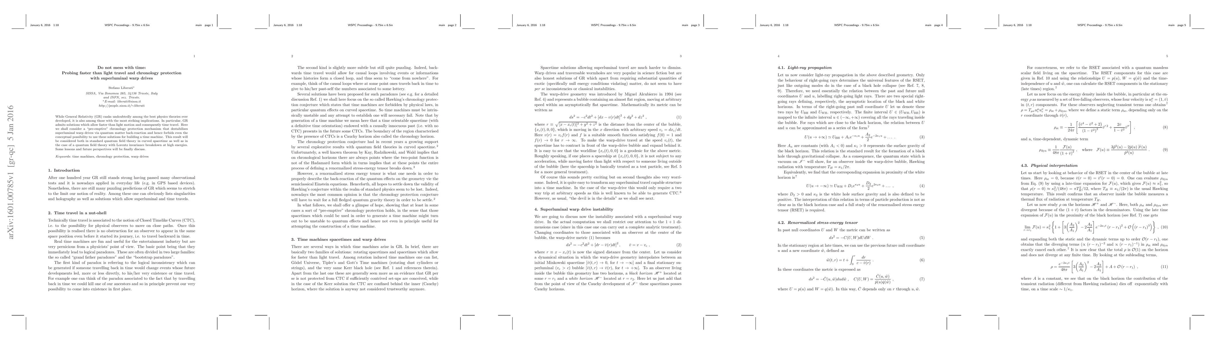 This paper explores the implications of faster-than-light travel in General Relativity, proposing a "pre-emptive" chronology protection mechanism that destabilizes superluminal warp drives through quantum matter back-reaction, thereby preventing the construction of time machines. The study considers both standard quantum field theory and scenarios with Lorentz invariance breakdown.