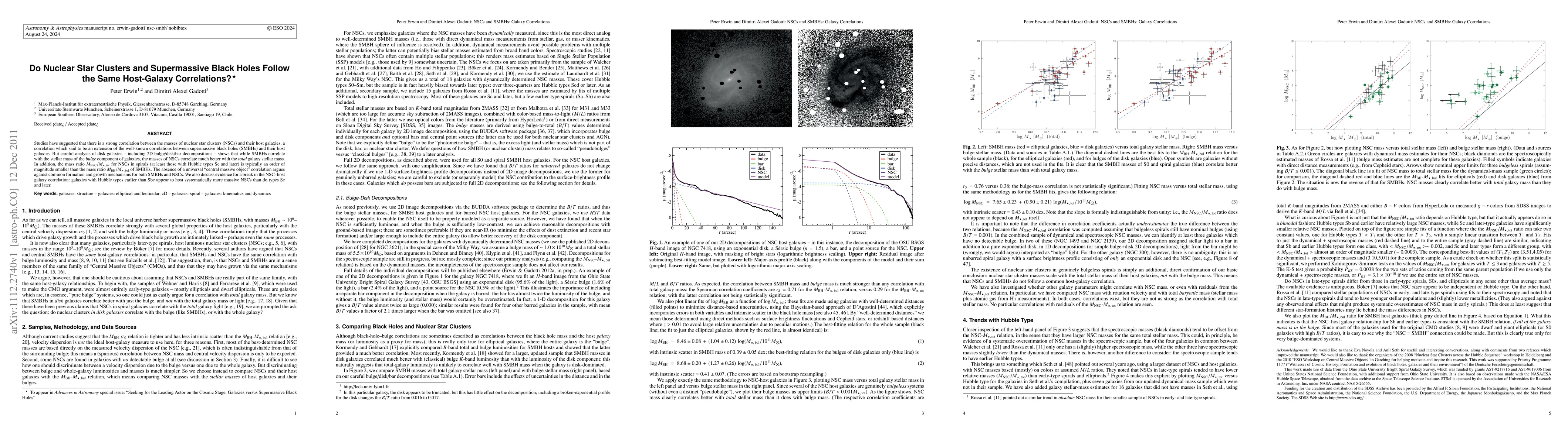 This study finds that nuclear star clusters (NSCs) correlate more strongly with the total stellar mass of their host galaxies, unlike supermassive black holes (SMBHs) which correlate with the stellar mass of the bulge component. The research suggests different formation and growth mechanisms for NSCs and SMBHs, and notes a break in the NSC-host galaxy correlation for earlier Hubble types.