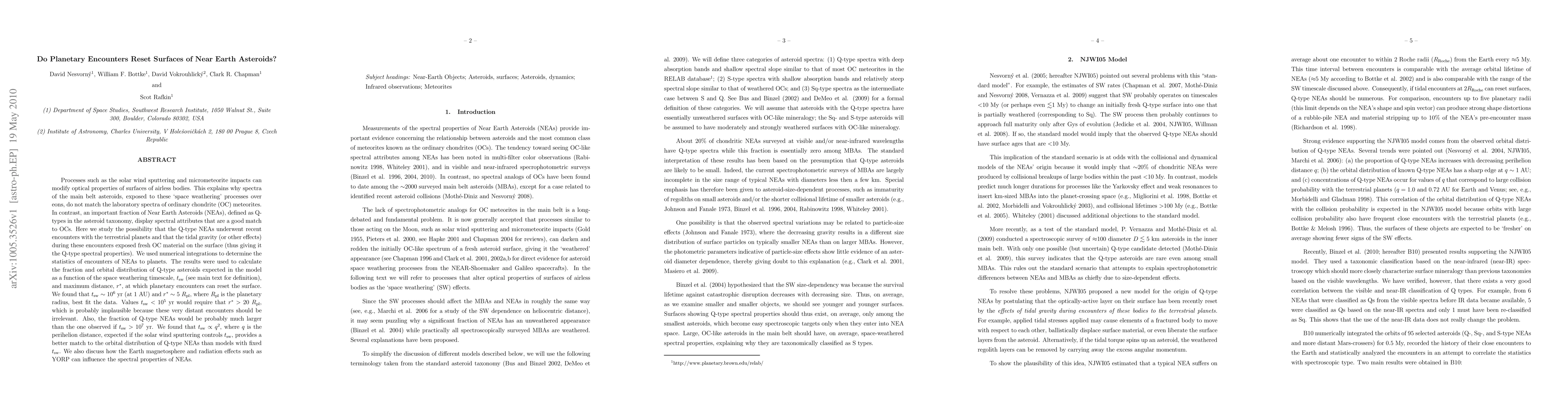 This paper investigates whether planetary encounters can reset the surfaces of Near Earth Asteroids (NEAs), explaining why some NEAs (Q-type) match the spectral properties of ordinary chondrite meteorites. The study finds that t_sw ~ 1e6 yr and r* ~ 5 R_pl best fit the observed data, suggesting tidal gravity from recent planetary encounters can expose fresh material on NEAs.