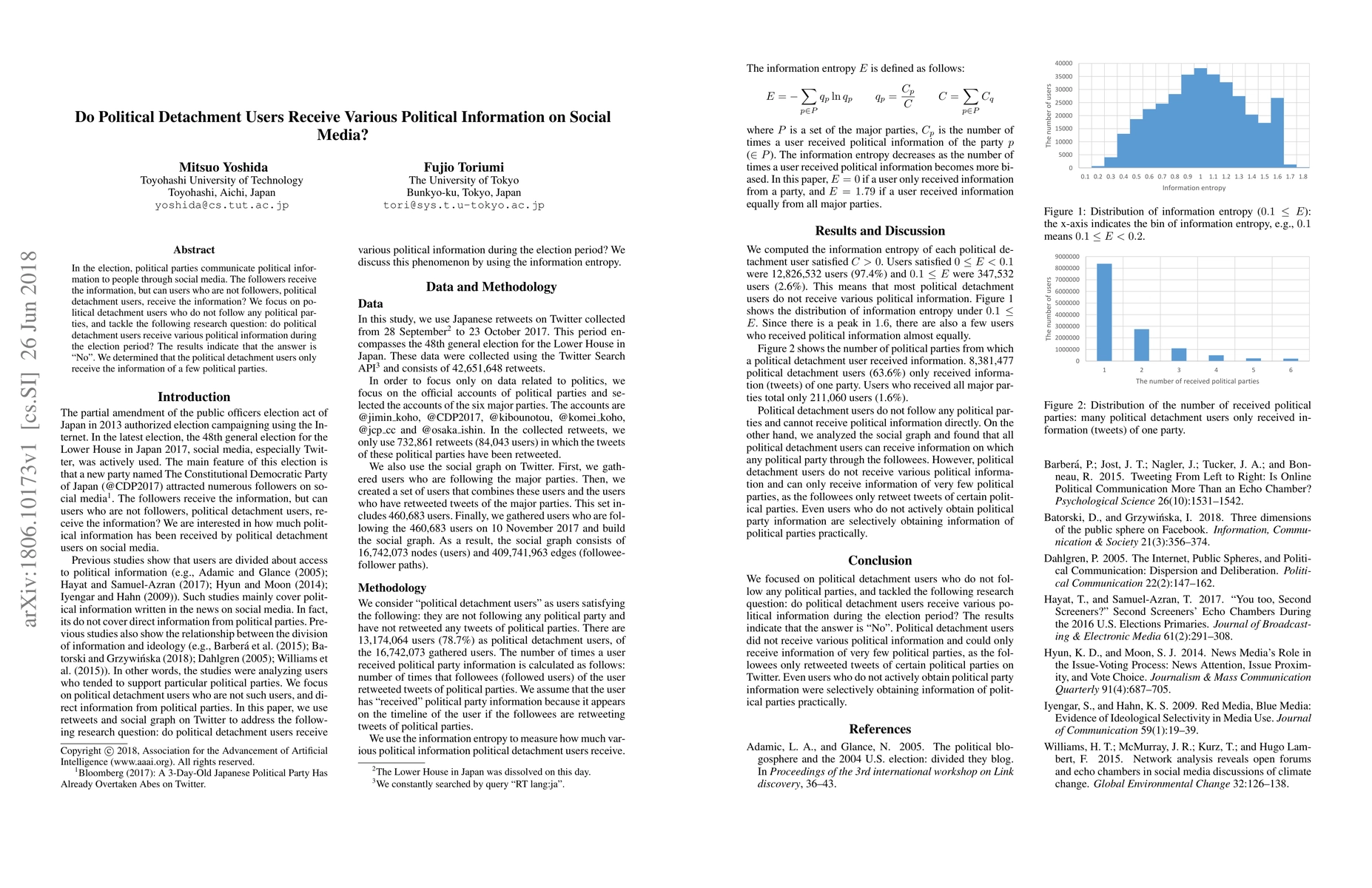 In the election, political parties communicate political information to people through social media. The followers receive the information, but can users who are not followers, political detachment users, receive the information? We focus on political detachment users who do not follow any political parties, and tackle the following research question: do political detachment users receive various political information during the election period? The results indicate that the answer is No. We determined that the political detachment users only receive the information of a few political parties.