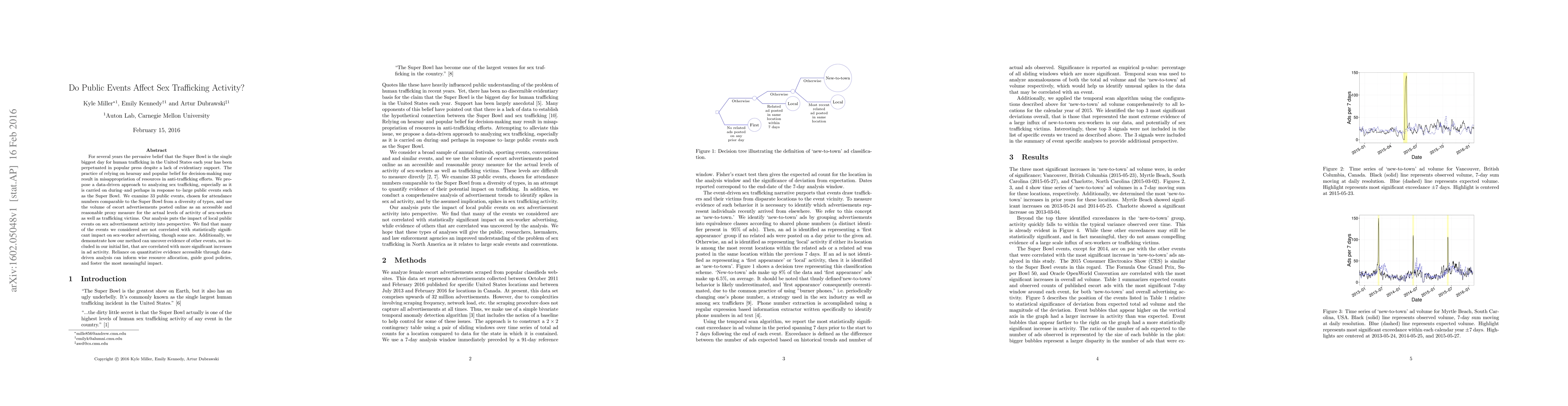 This study investigates the correlation between large public events and sex trafficking activity, using online escort advertisements as a proxy. The research finds that while some events show a significant impact, many do not, challenging the popular belief that the Super Bowl is the biggest day for trafficking in the U.S. This data-driven approach highlights the importance of evidence-based decision-making in anti-trafficking efforts.