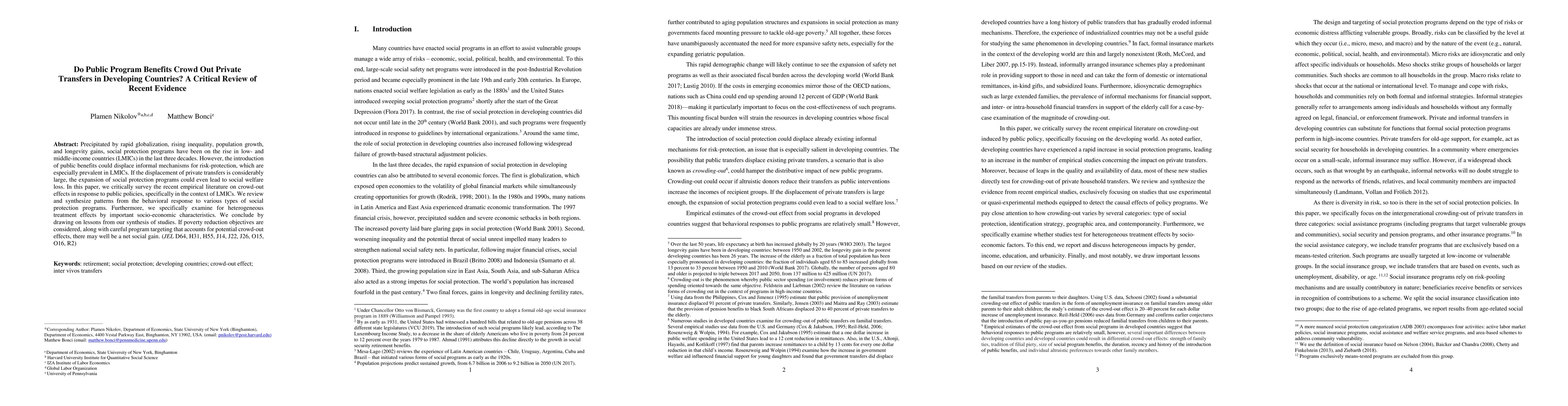A review of recent evidence suggests that public program benefits may crowd out private transfers in developing countries, but careful targeting and consideration of poverty reduction objectives can mitigate this effect.