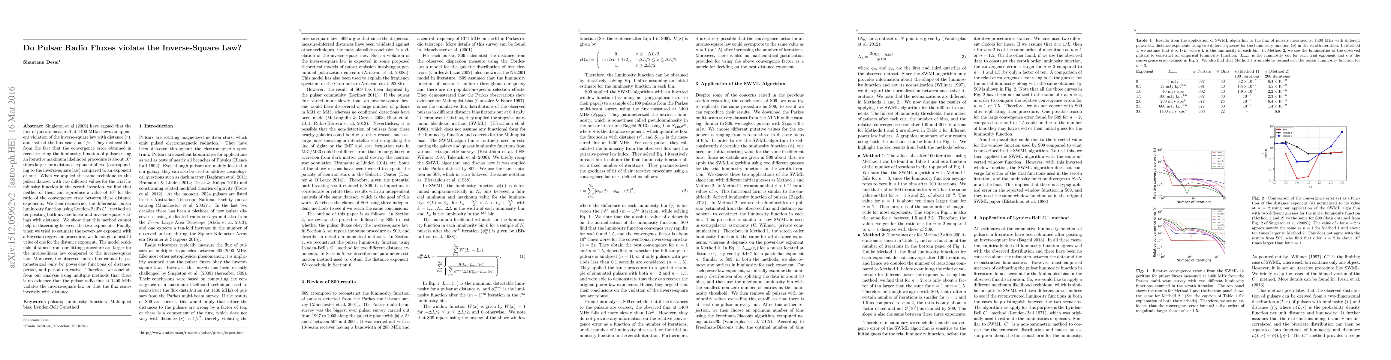 Singleton et al. (2009) suggested pulsar radio fluxes might violate the inverse-square law, but subsequent analyses using multiple methods found no evidence supporting this claim. The results indicate that the pulsar flux adheres to the inverse-square law rather than an inverse-linear scaling.